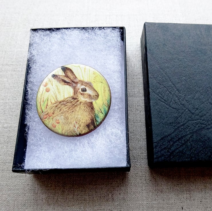 This charming ceramic brooch features my original artwork of a hare. It measures one and a half inches diameter and comes complete with a smart black box. It will come with a complementary gift card featuring my original artwork.