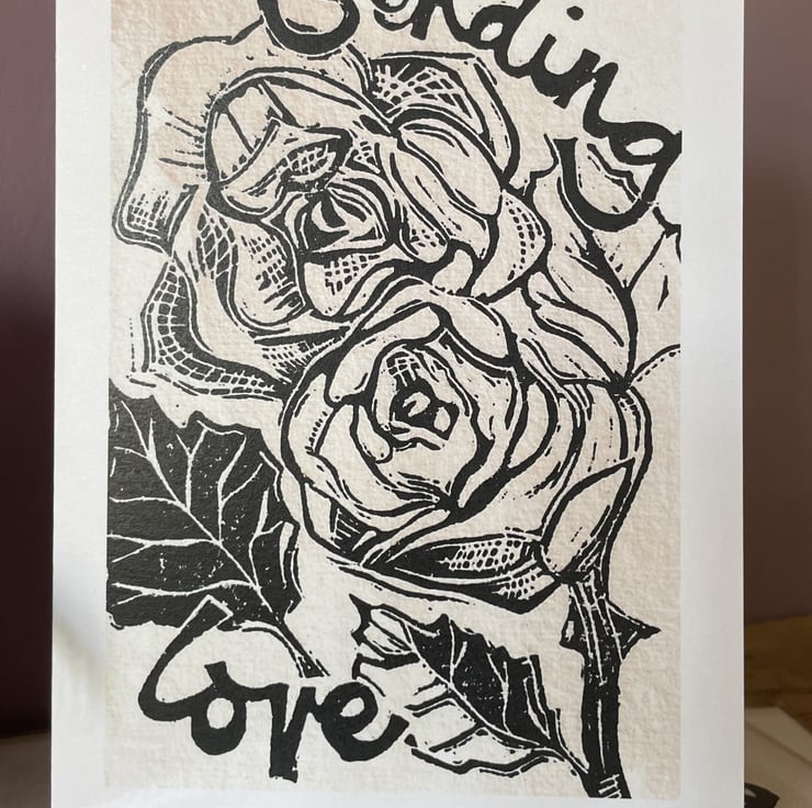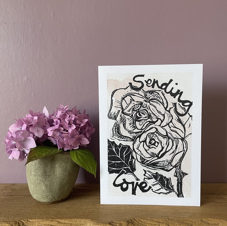 This card features a digital reproduction of my original lino print ‘Sending Love’.