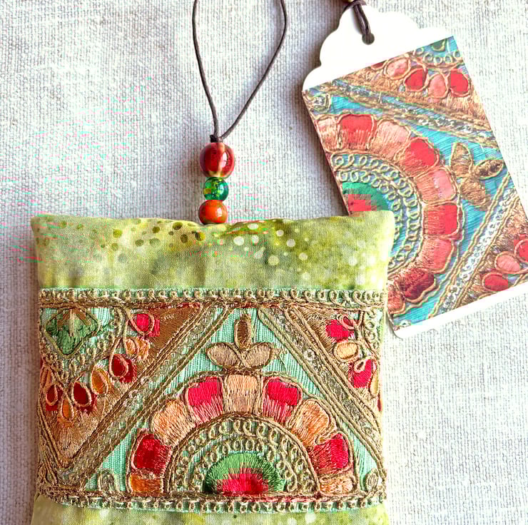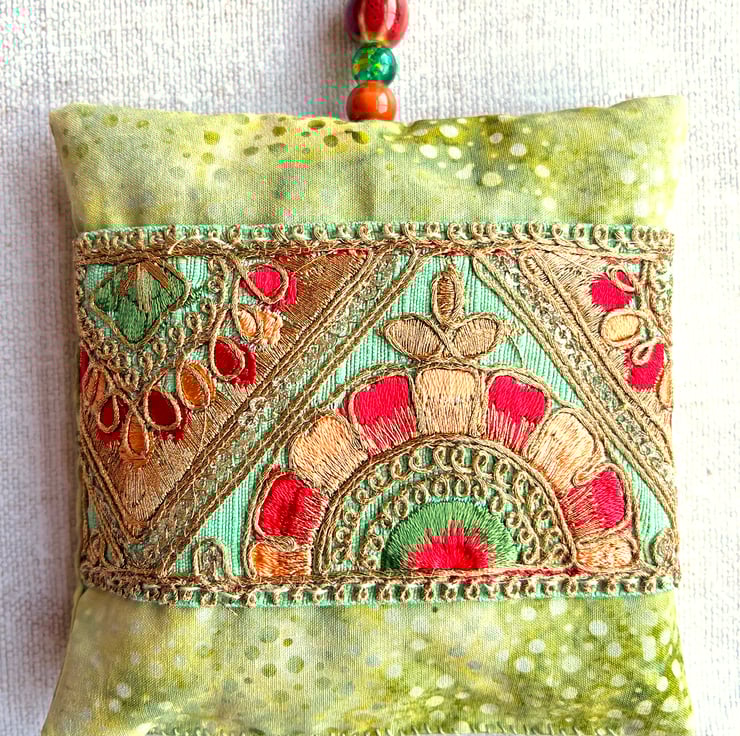 The lavender bag has been made with pretty batik fabric and filled with dried lavender from this year's harvest from Provence. It's decorated with a section of embroidered Indian trim which I've hand stitched onto the fabric. The trim has metallic gold threads which gives it a lovely shimmer. I've added a few matching ceramic and glass beads to the hanging loop.