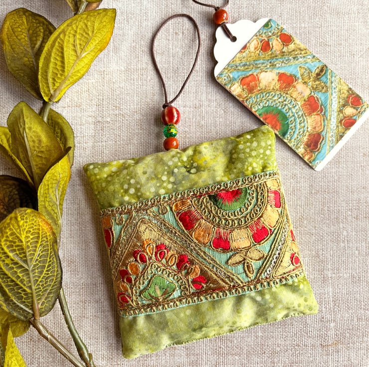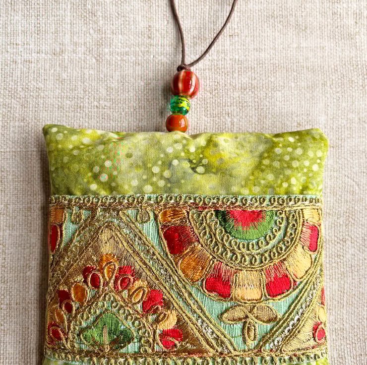 The lavender bag has been made with a pretty, pale green batik fabric and filled with dried lavender from Provence. It's decorated with a section of embroidered Indian trim which I've hand stitched onto the fabric. I've added a few ceramic and glass beads to the hanging loop.