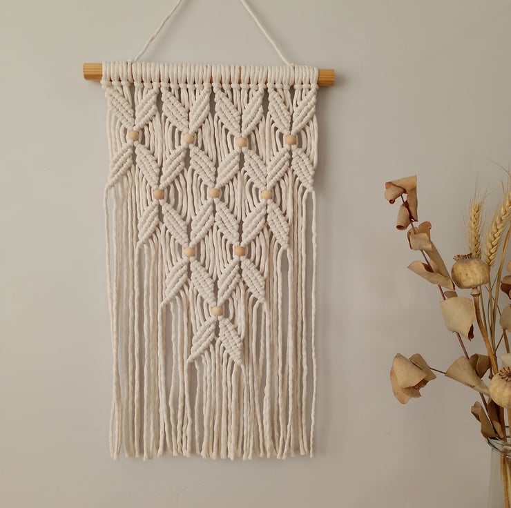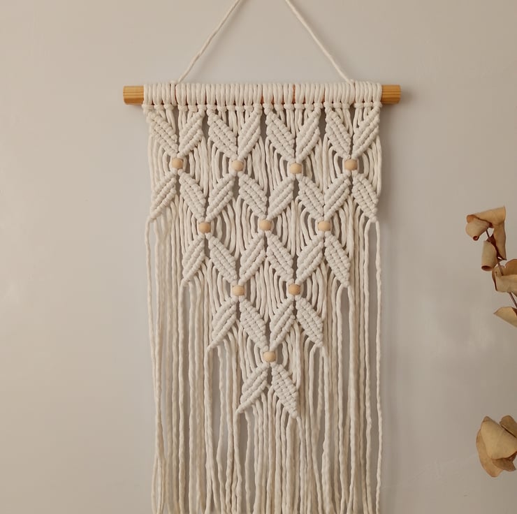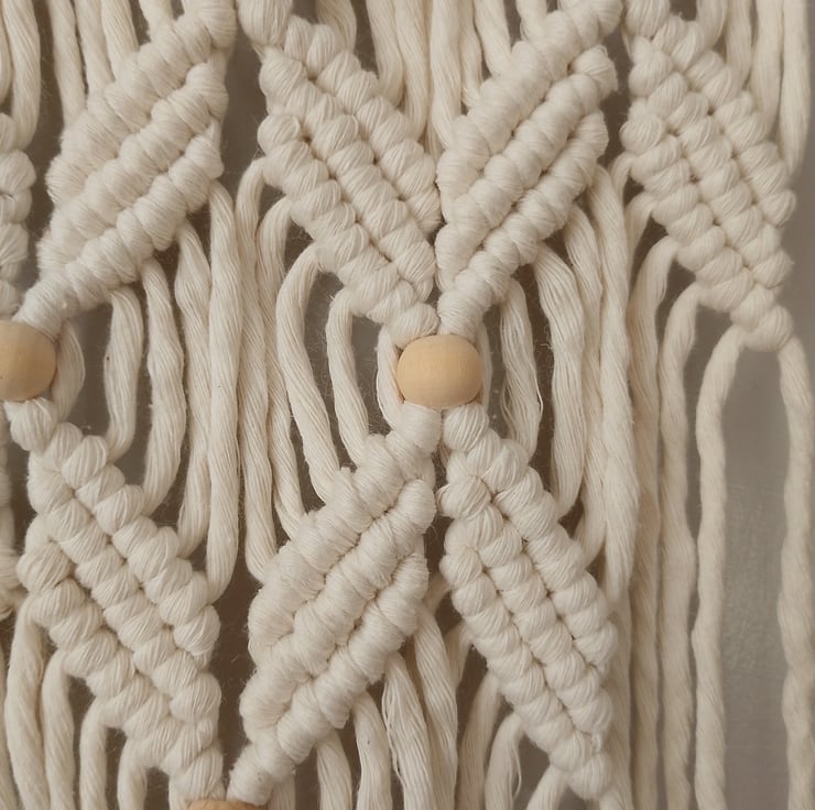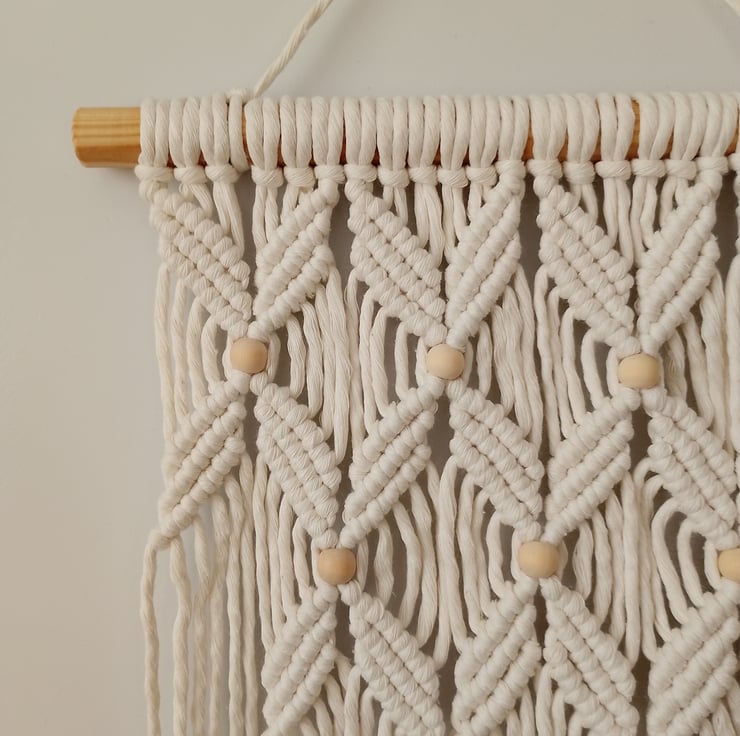 This gorgeous boho wall hanging features a lovely geometric pattern with wooden beads. This is a lovely neutral wall hanging that would look geat in any room.