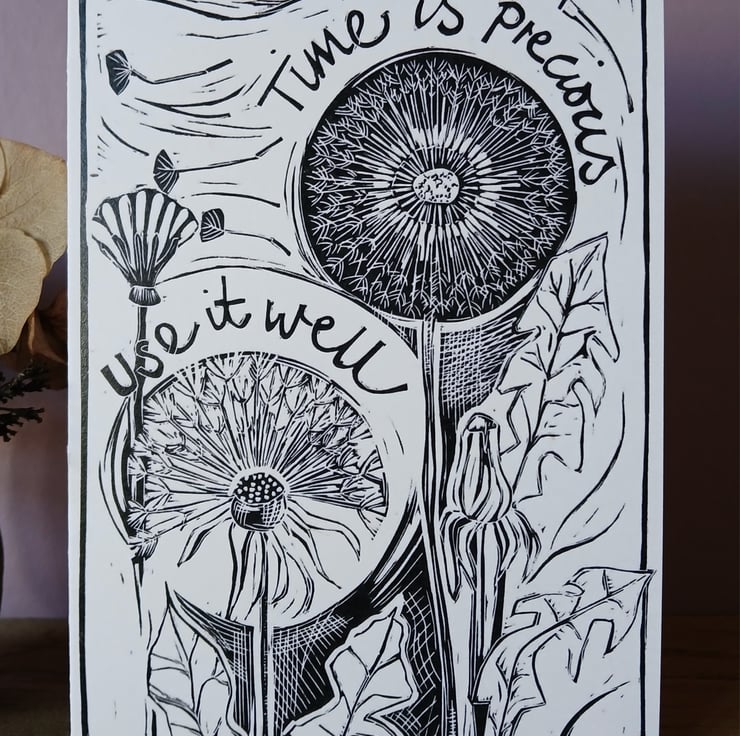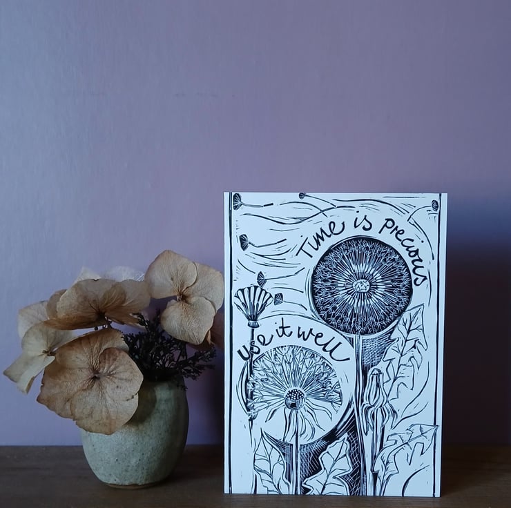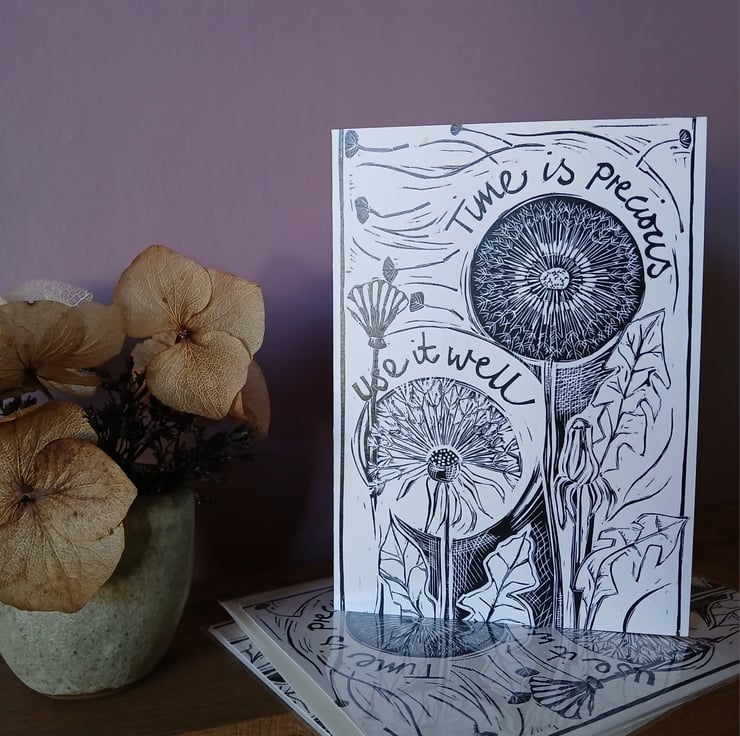 This card features a digital reproduction of my original lino print ‘Time is Precious’.