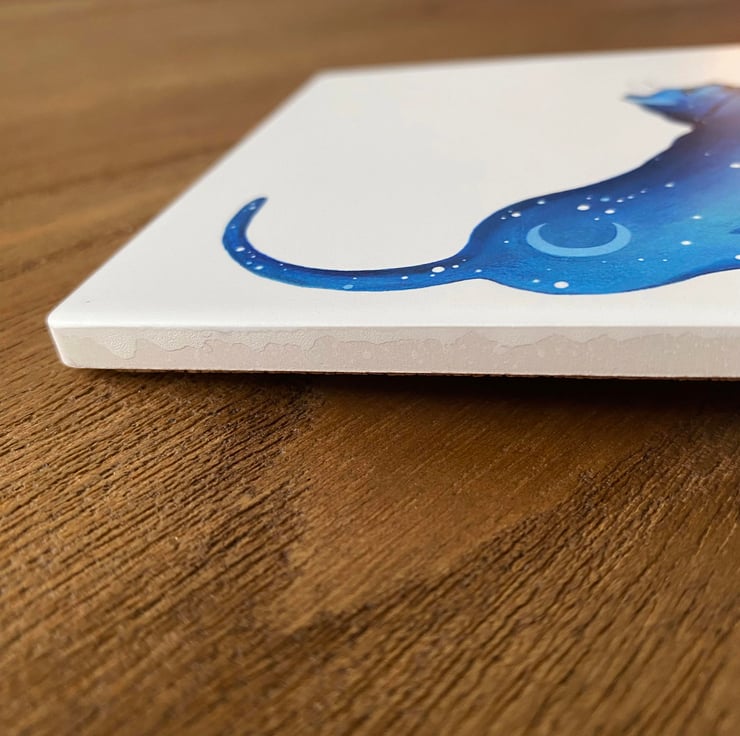 This unique ceramic coaster has a lovely, smooth sandstone finish, with a cork back. It shows off my drawing - Lunar Cat Sitting.