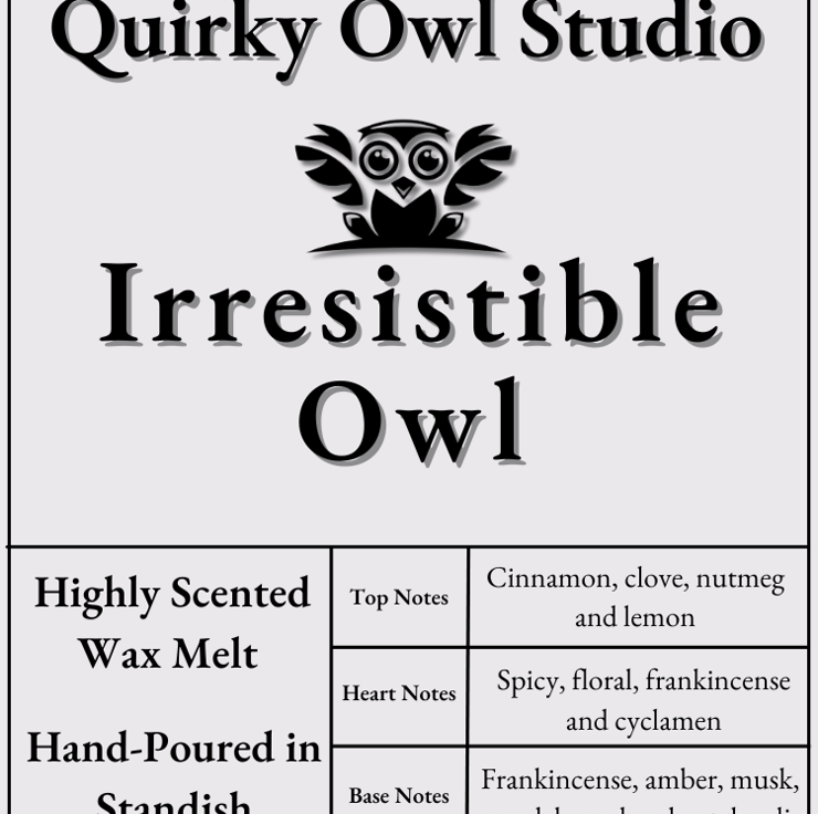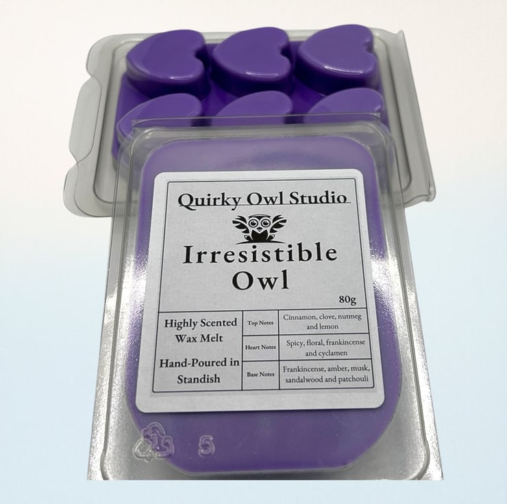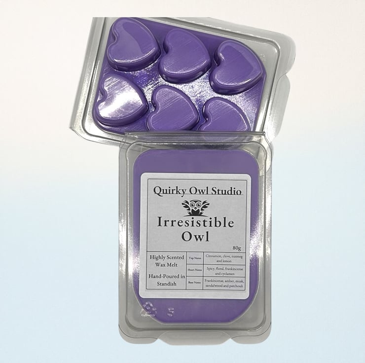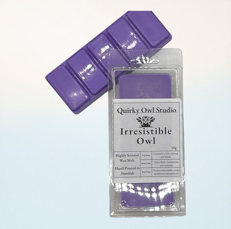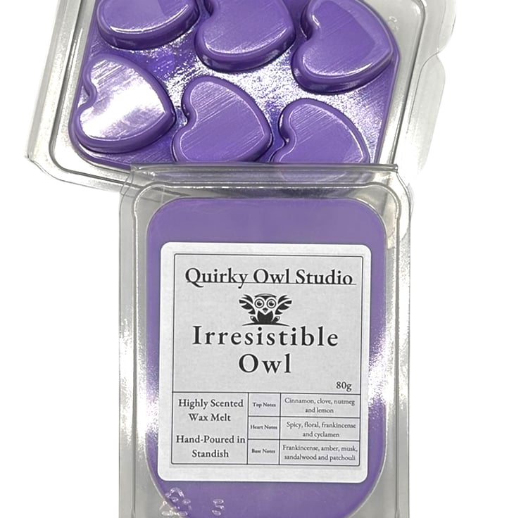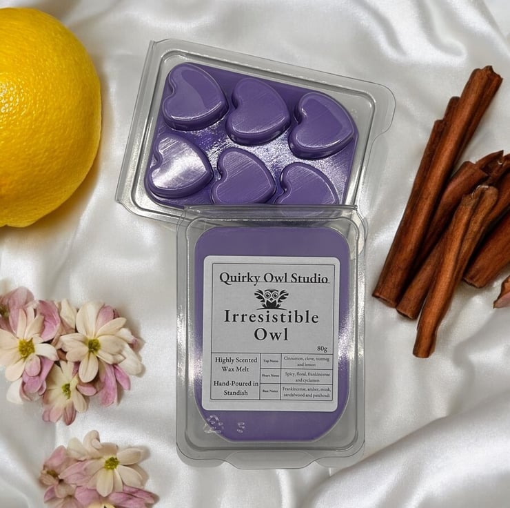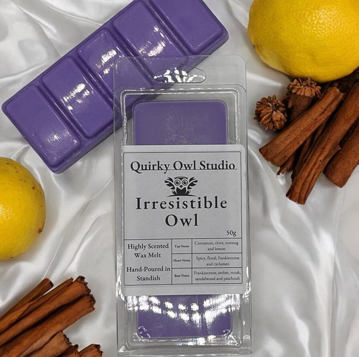 This wax melt features a delightful blend of warming spices, zesty lemon, enchanting dark florals, and warm woods. The result is a cosy and vibrant fragrance that envelops you in a warm hug, filling your home with a long-lasting aroma. Mica is added to the wax to create a lovely shimmer when melted. My melts are made from natural, responsibly sourced, vegan-friendly soy wax and premium fragrance oils.