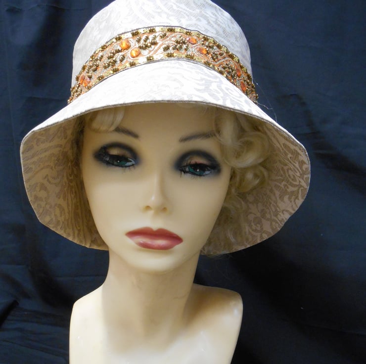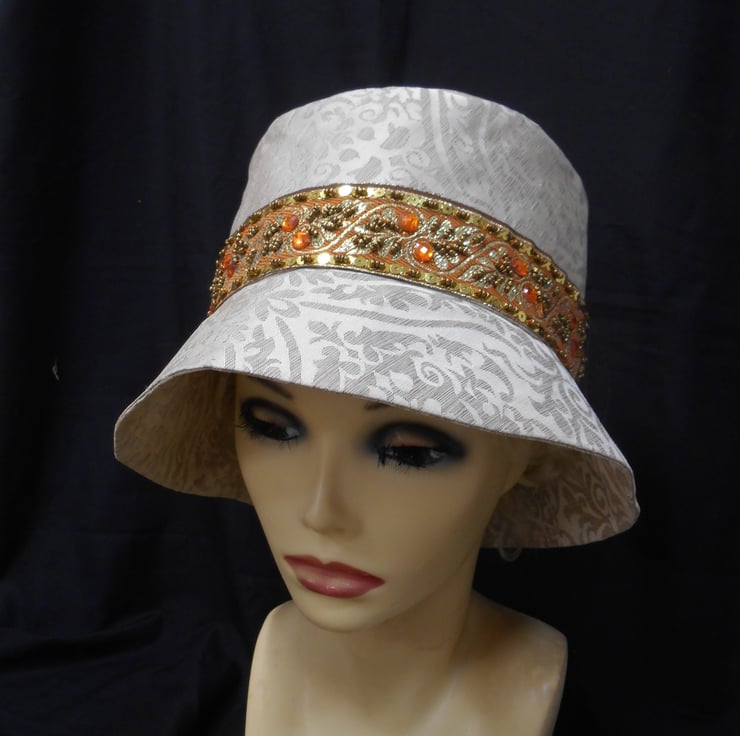 Made from a furnishing quality brocade fabric which has a self pattern. All around the crown I have added a beautiful band of sequin and bead braid in gold and orange. This is a large size hat which measures approximately 23" (58.42cm) around the inside of the crown. Ut id fully lined with the same fabric as the outside of the hat. It is light weight and easy to wear