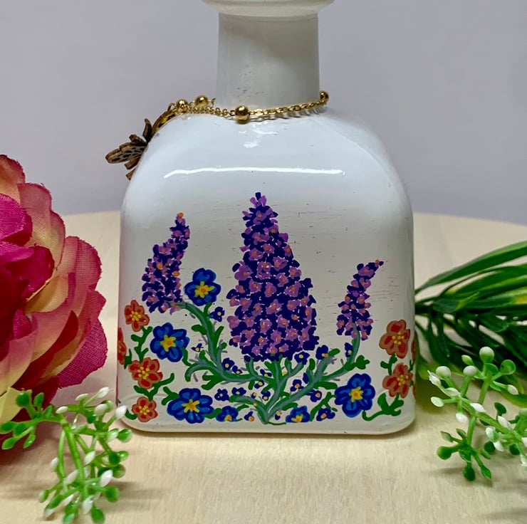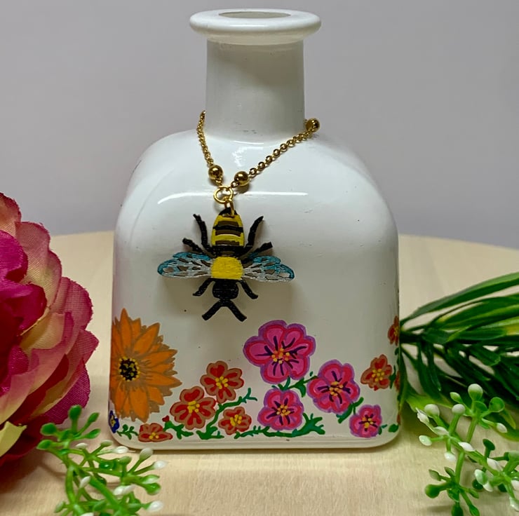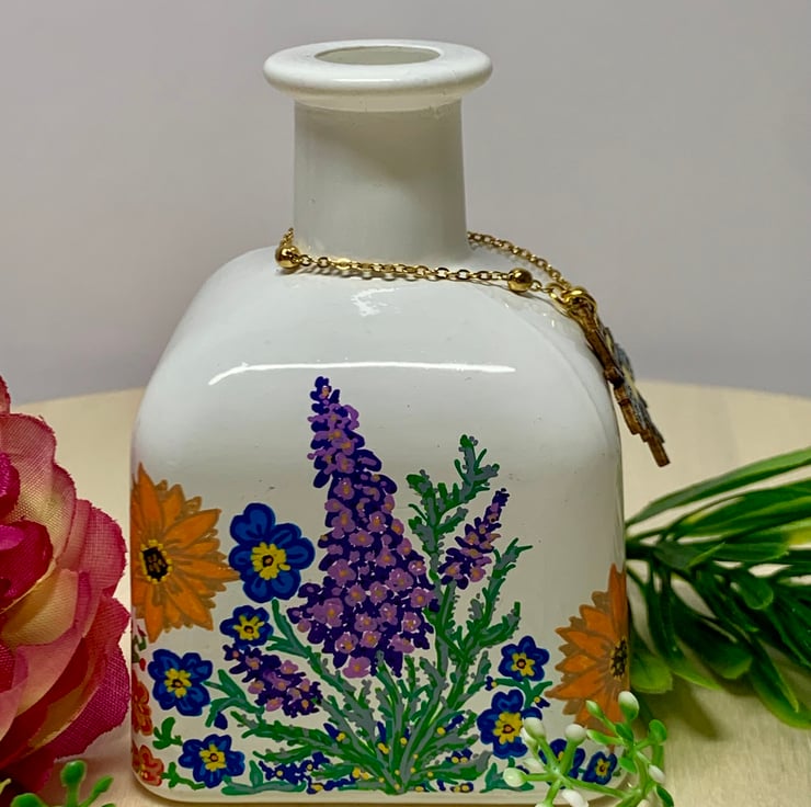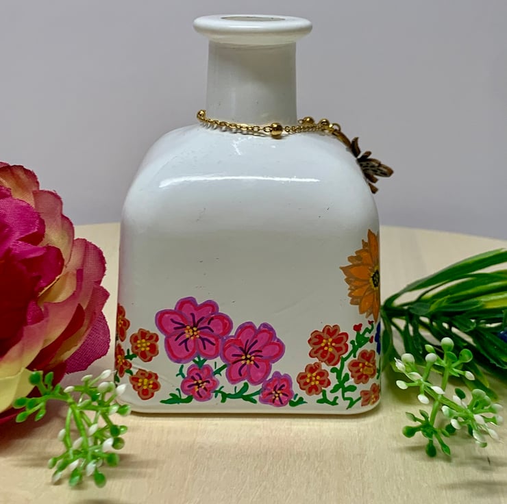 One of a Kind hand painted glass bud vase.This started out as a plain white vase which I've recycled. Bright dainty flowers stand out against the white background. Pops of bright happy colours bring a smile to your face especially on a dreary day. I have painted the design on all four sides to give a 360 view. Pink, orange, purple, blue, red, yellow and green hues blend beautifully together. As an extra little touch I have added a hand painted Bee which is hung on a Gold Plated piece of chain around the neck of the vase. This can be placed on any side or removed if you prefer.