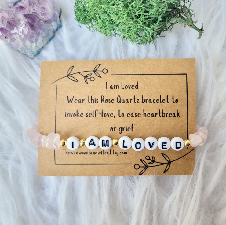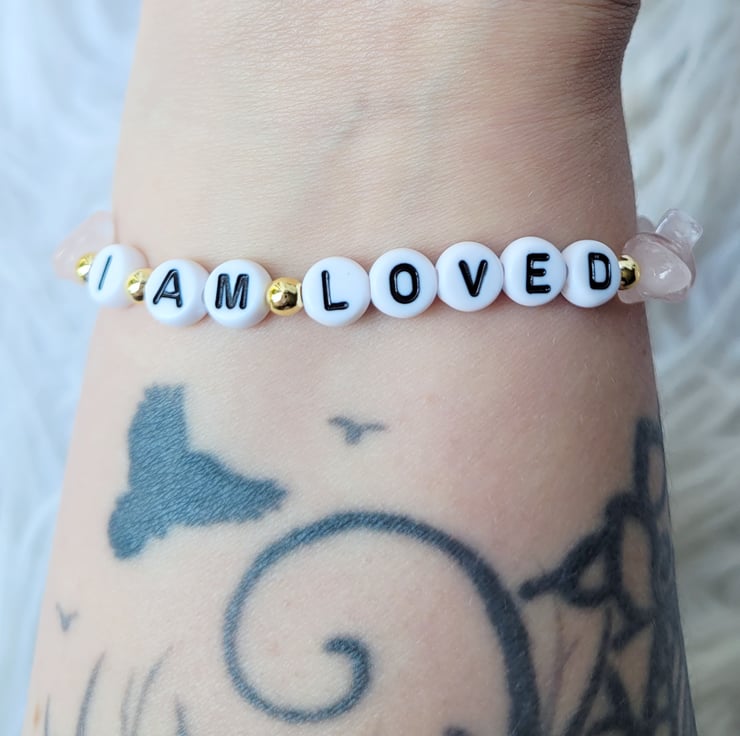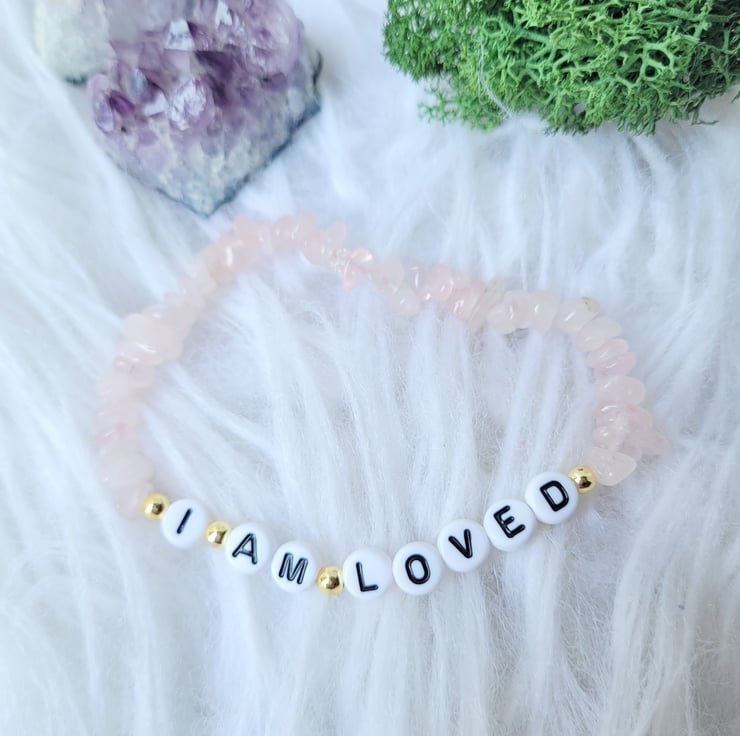 Embrace self-love and compassion with this handmade Rose Quartz affirmation bracelet, designed to remind you that you are truly loved. Featuring acrylic letter beads that spell "I AM LOVED", this bracelet serves as a gentle affirmation of worth and connection.