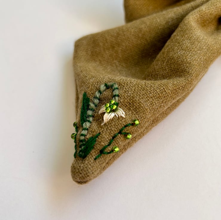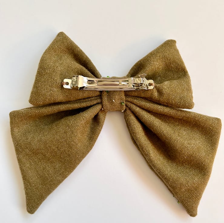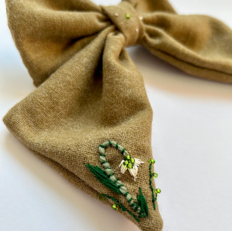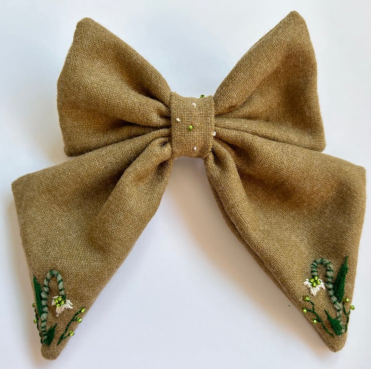 Large hand embroidered snowdrop flower wool earthy green beaded embellished hair bow.