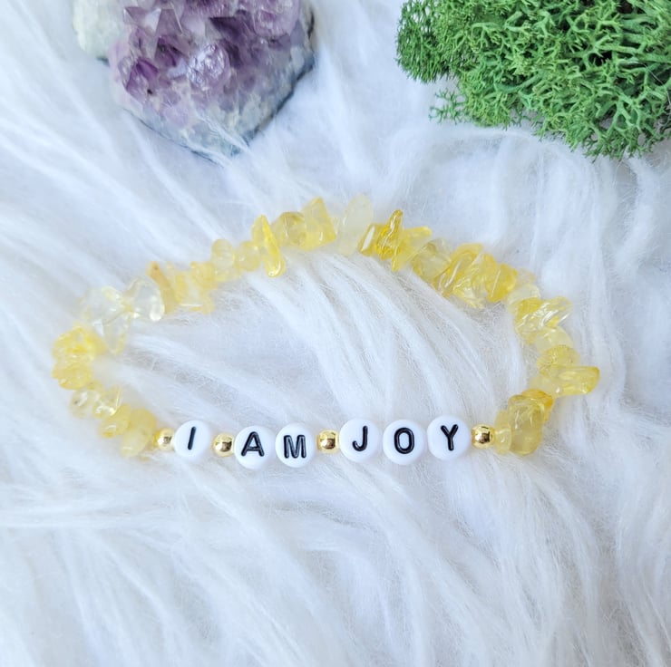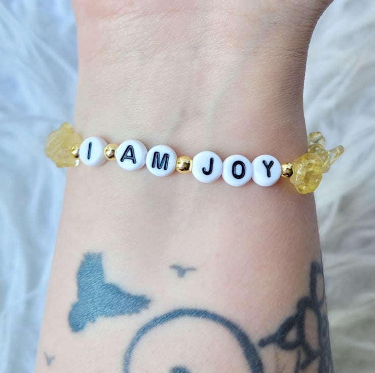 Radiate positivity with this handmade Citrine affirmation bracelet, designed to uplift and inspire happiness. Featuring acrylic letter beads that spell "I AM JOY", this bracelet serves as a daily reminder to embrace optimism and abundance.