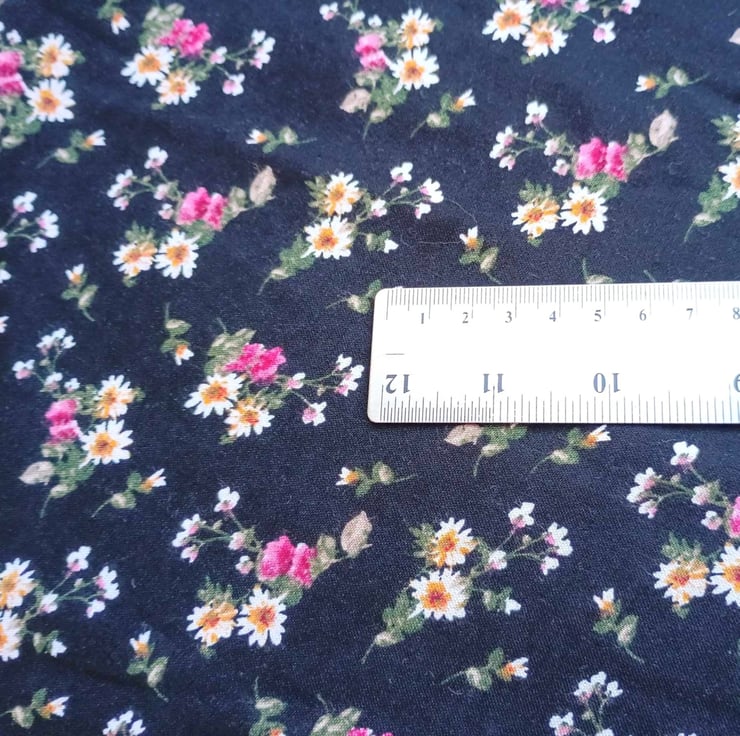 A viscose challis print fabric - ideal for summer dresses, skirts or blouses - with posies of beautiful pink and white flowers scattered across a soft black background. This lovely light-medium weight dressmaking fabric is very soft and has a beautiful drape.