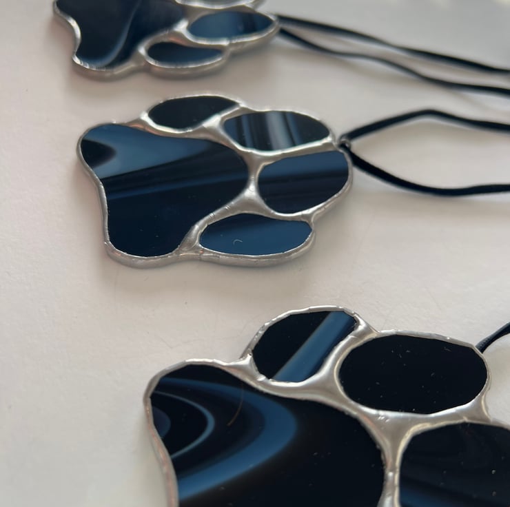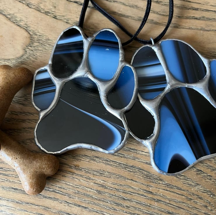 For the dog lover who has it all! A carefully crafted stained glass dog paw in an opaque black and white swirl with a shiny silver solder. Due to the variation in the pattern of the glass, each decoration is slightly different, just like your pet!