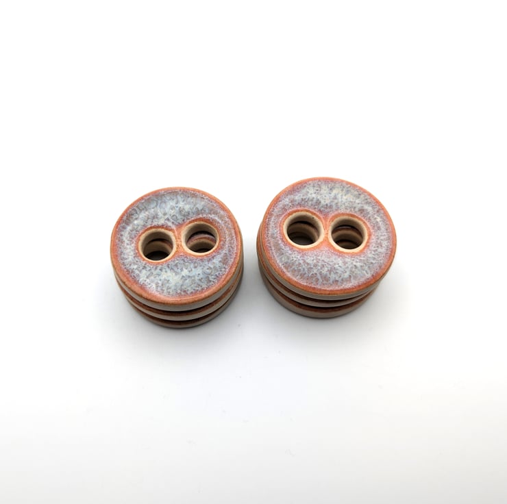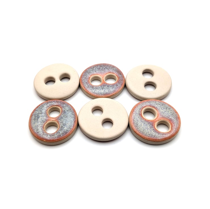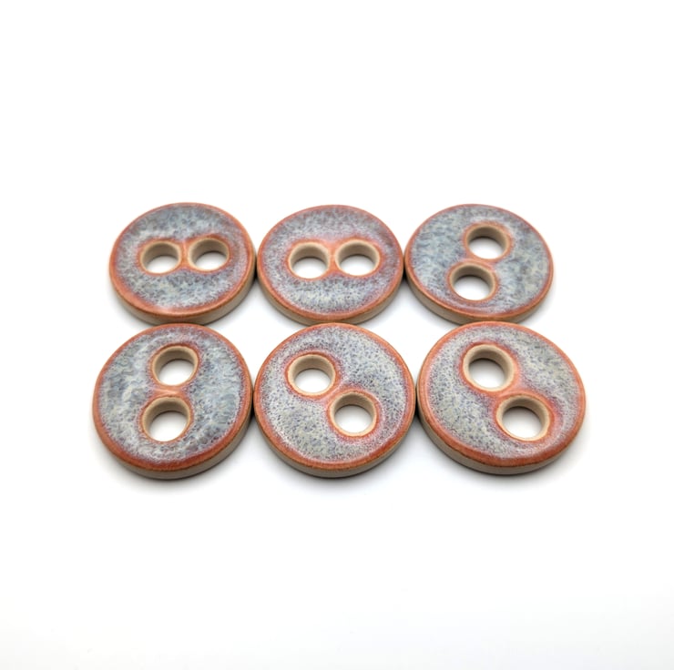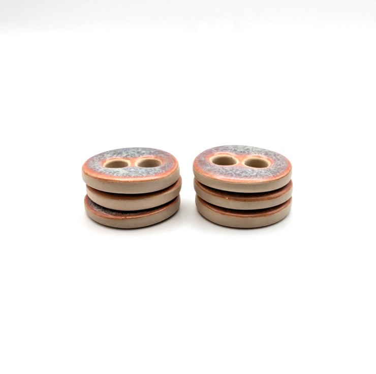 Set of 6 medium round handmade ceramic buttons decorated with pink kimchi effect glaze and made from white stoneware clay. Ideal to complete your knitting, crochet, sewing or other unique craft project!