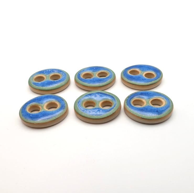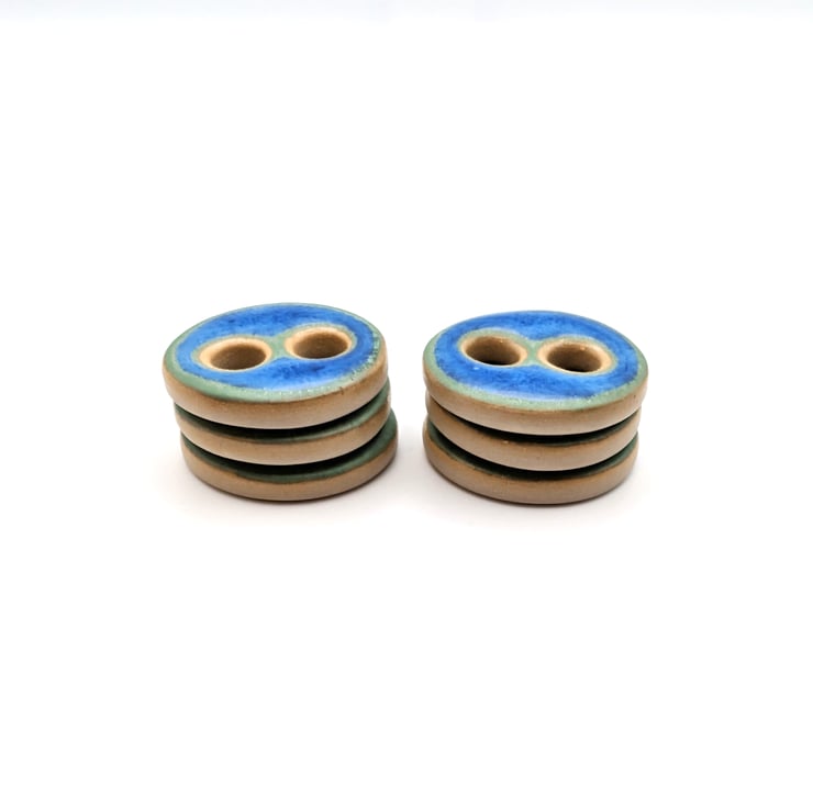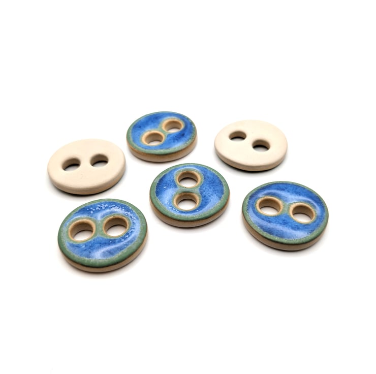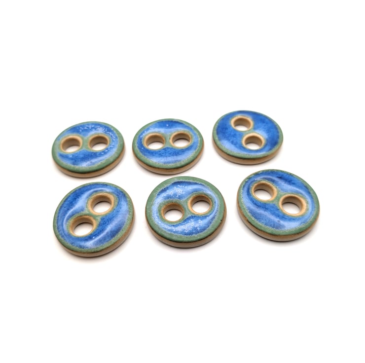 Set of 6 medium round handmade ceramic buttons made from a white stoneware clay and decorated with a blue glossy glaze that has hints of matt green around the edges. Ideal to complete your knitting, crochet, sewing or other unique craft project!