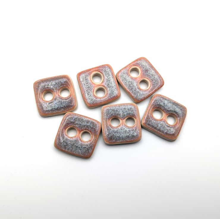 Set of 6 medium square handmade ceramic buttons decorated with pink kimchi effect glaze and made from white stoneware clay. Ideal to complete your knitting, crochet, sewing or other unique craft project!