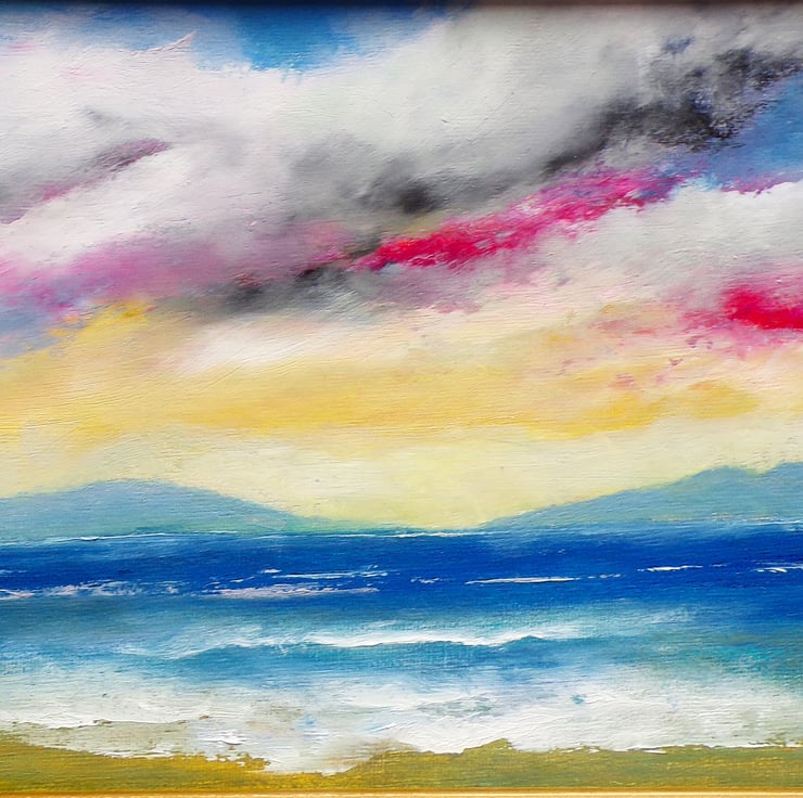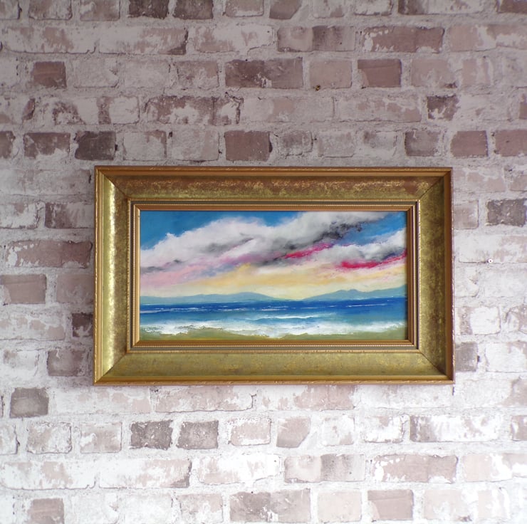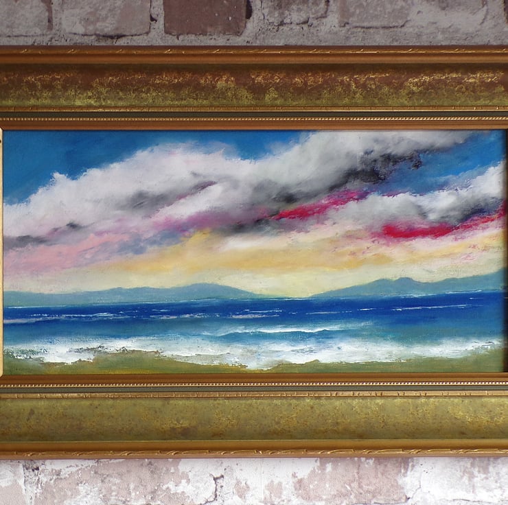 original contemporary Tonalism style seascape oil painting on board in vintage gold frame, with a bright multi color sky, size 32cm high x 52cm wide including frame, on the back is a certificate of authenticity from the artist , lovely bright and colorful picture with lots of atmosphere ,this would hang well in any type of home setting,
