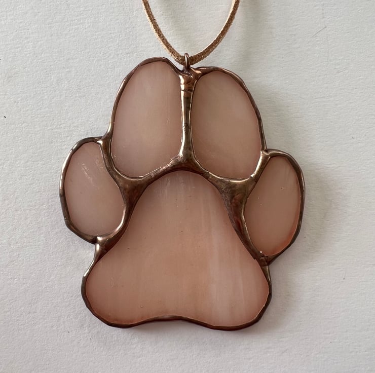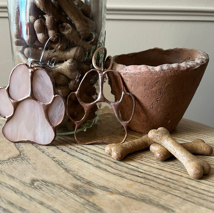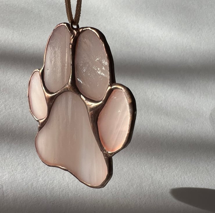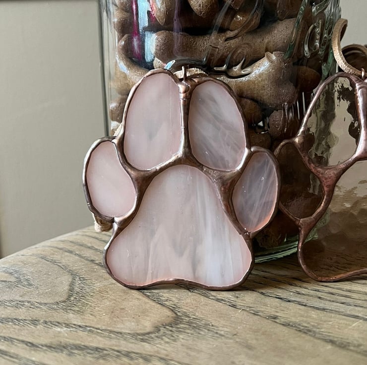 A pretty stained glass dog paw in delicate blush opal wispy glass. Finished with a copper patina, this delicate tone is a sophisticated way to celebrate your favourite pup.