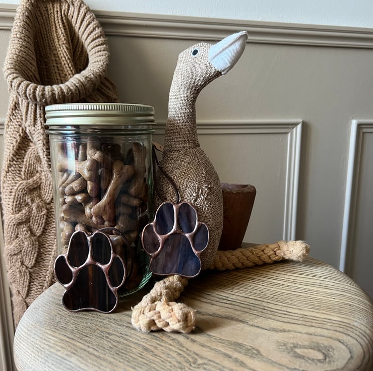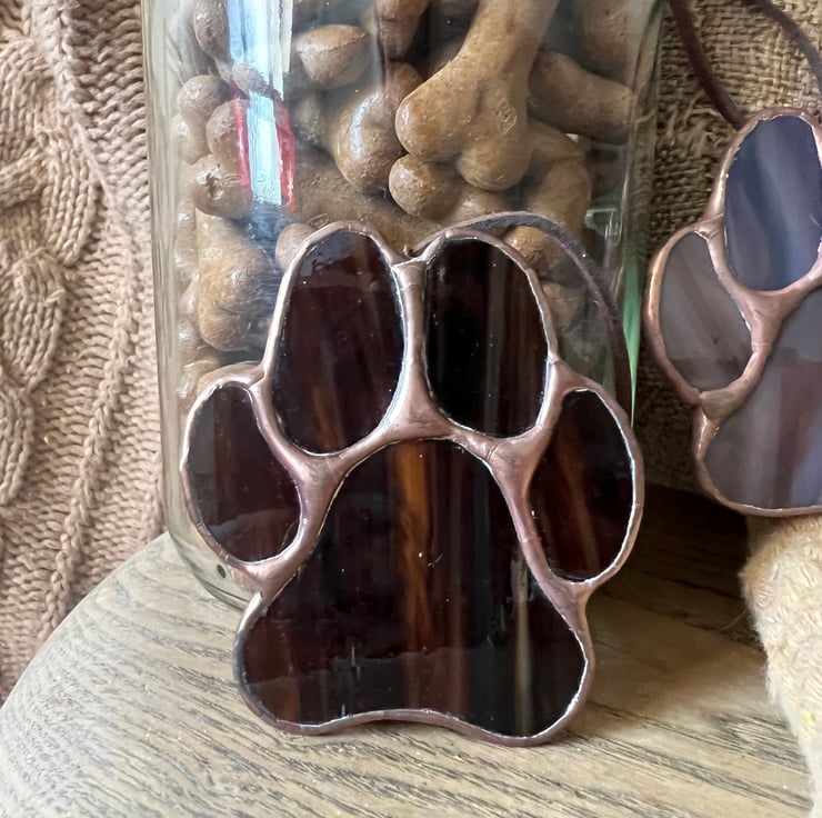 A stained glass dog paw made in gorgeous rich dark chocolate brown glass. This is my chocolate Labrador and liver spaniel glass! Finished with a copper patina, it is great for any dog lover and their pup.