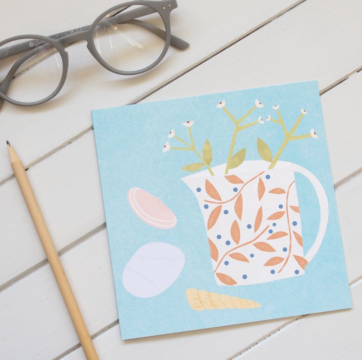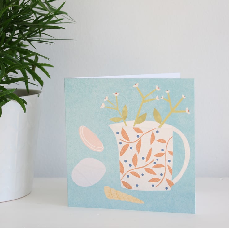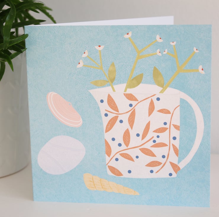 A blank greetings card featuring my 'Beachcombers Jug' still life illustration.