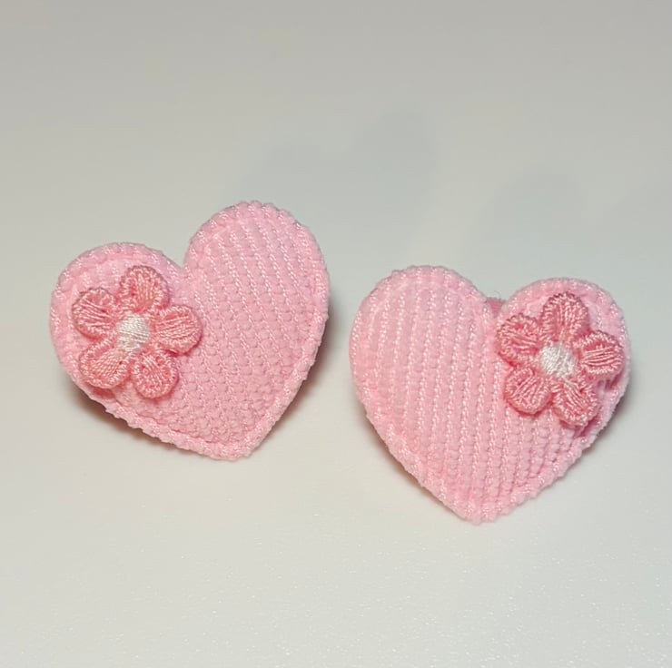 Handmade Baby Pink Corduroy hearts with Baby Pink cotton sewn daisy flowers, set on Pink mini bands for a soft comfortable hold.