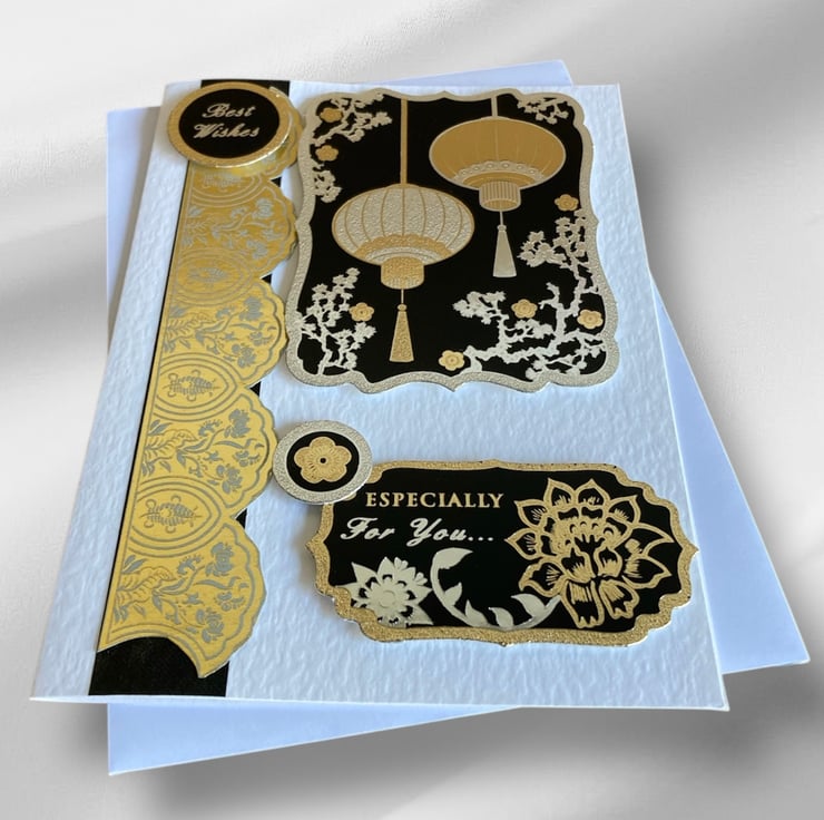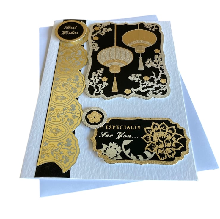 This striking Japanese card in black, gold and silver features lanterns set on a black background with a foiled floral design applied in 3D.