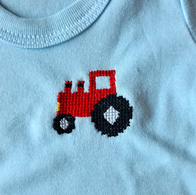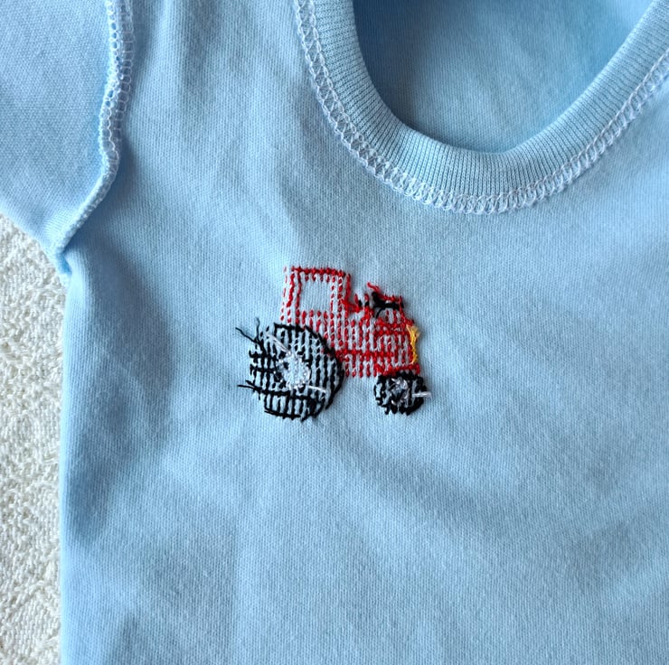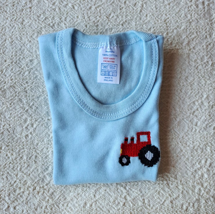 What a lovely gift for a tiny boy! I have hand embroidered a red tractor on the left front of this soft, pale blue cotton T-shirt. The shirt has short sleeves and a round neck. All the edges, hem, sleeves and neck, are bound with matching ribbing. As I never use a permanent backing material when embroidering kids' clothing, there is nothing inside to irritate your baby's skin. The shirt is machine washable.