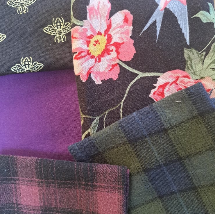 This bundle is so brooding it feels like it strode out of the pages of a Mills & Boon romance. Fourteen assorted rescued and repurposed pieces, nearly all cotton except for one viscose (got to include that gorgeous black floral) and one lightweight vintage tweed. Blacks, purples and deep reds.