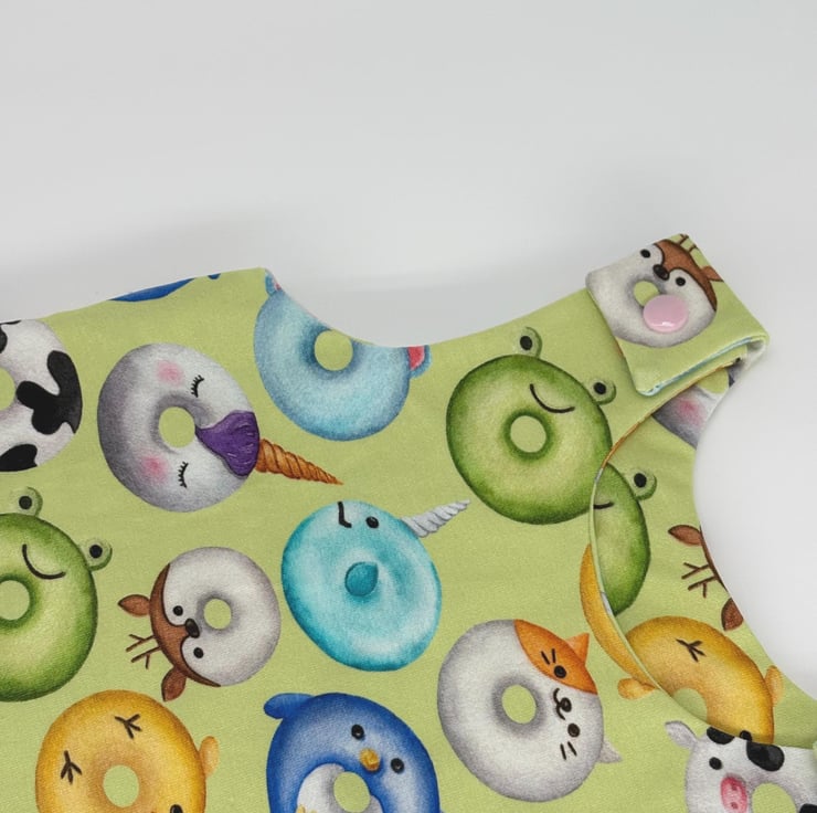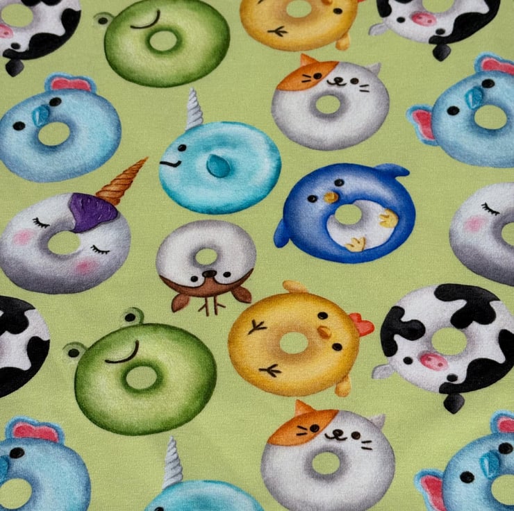 These are handmade dungarees in an animal doughnut print stretchy cotton jersey fabric, with matching cuffs and plastic snaps. They are semi-lined. The cuffs can be worn up or down. They are designed to be baggy so I would recommend you size down if you want a tighter fit. The cotton jersey fabric is OEKO-TEX standard, 95% cotton and 5% elastane.