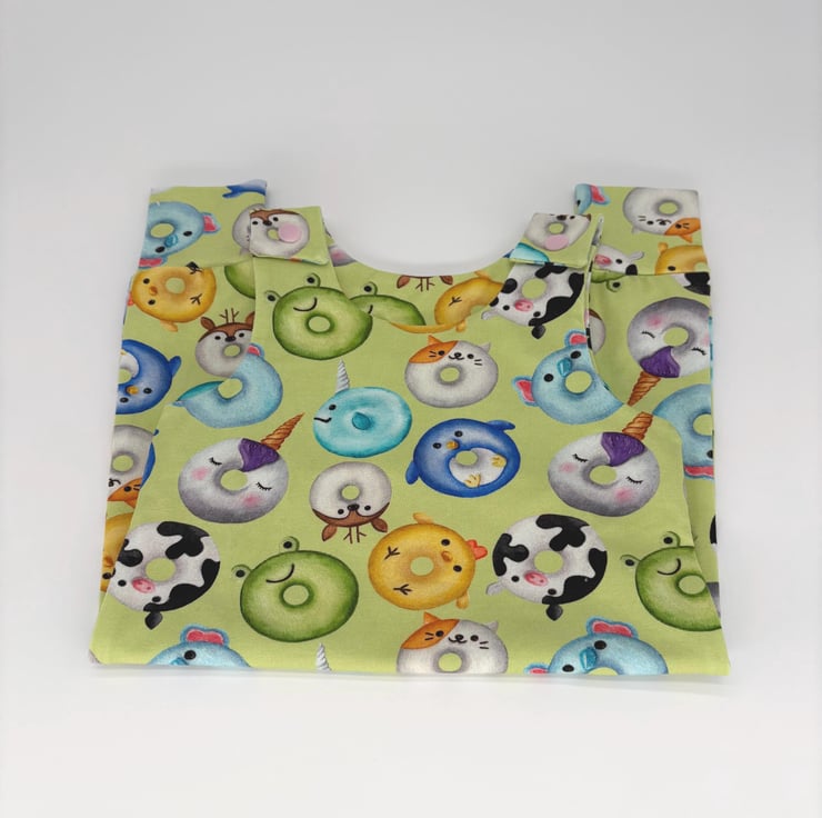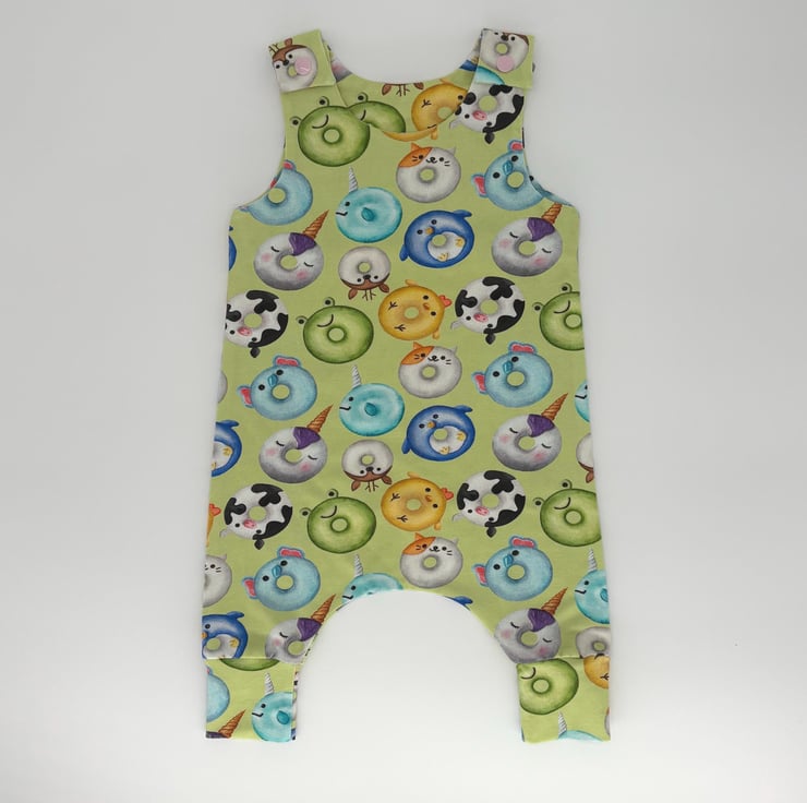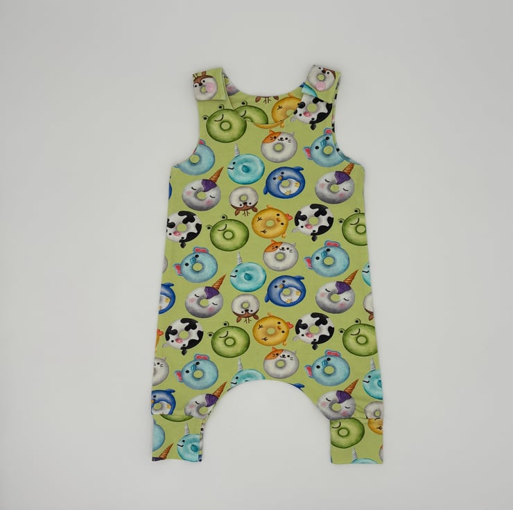 Handmade dungarees in an Animal Ring Doughnut print.
