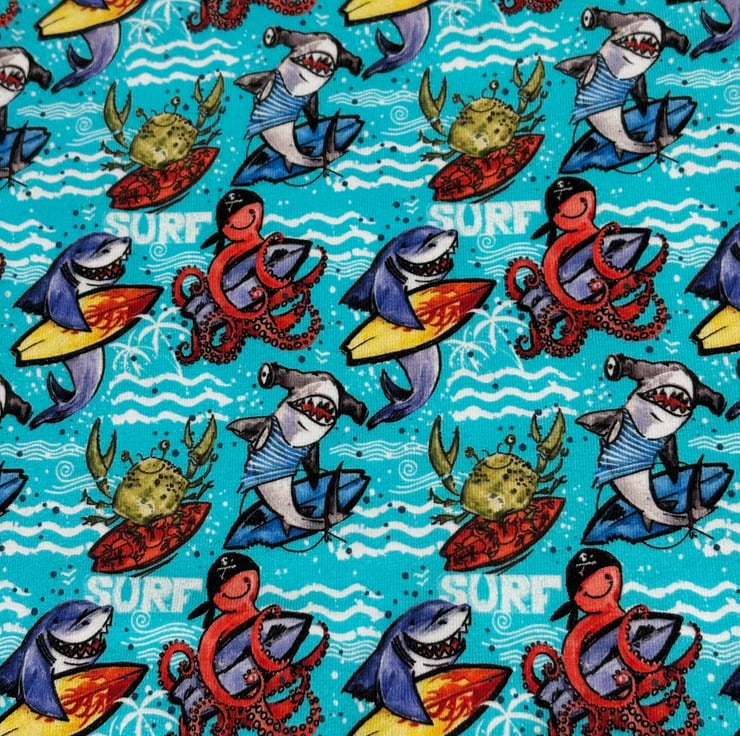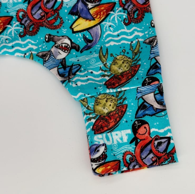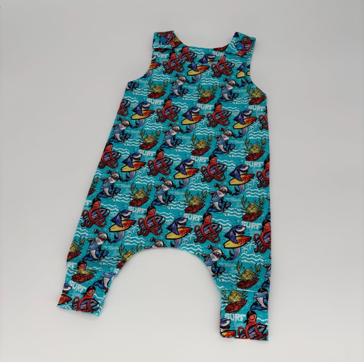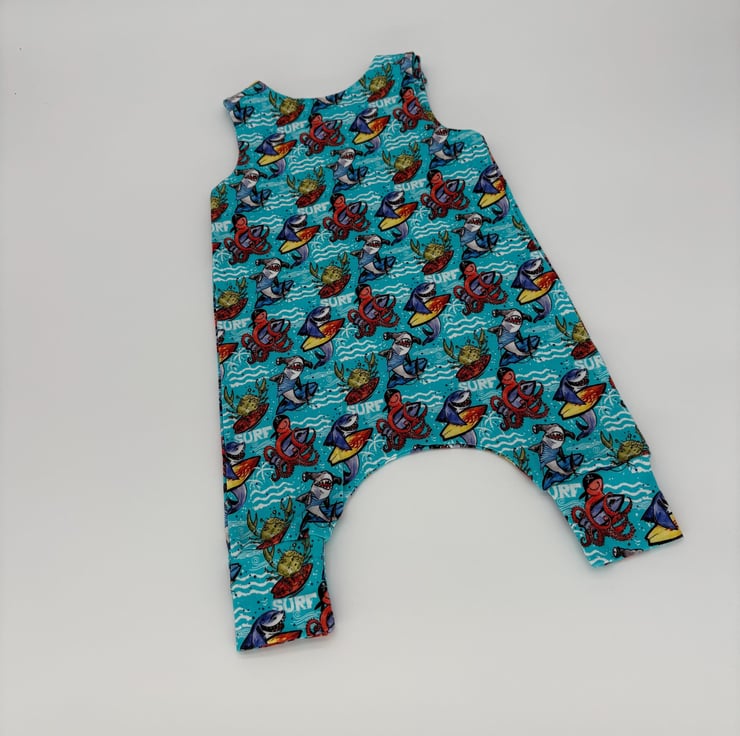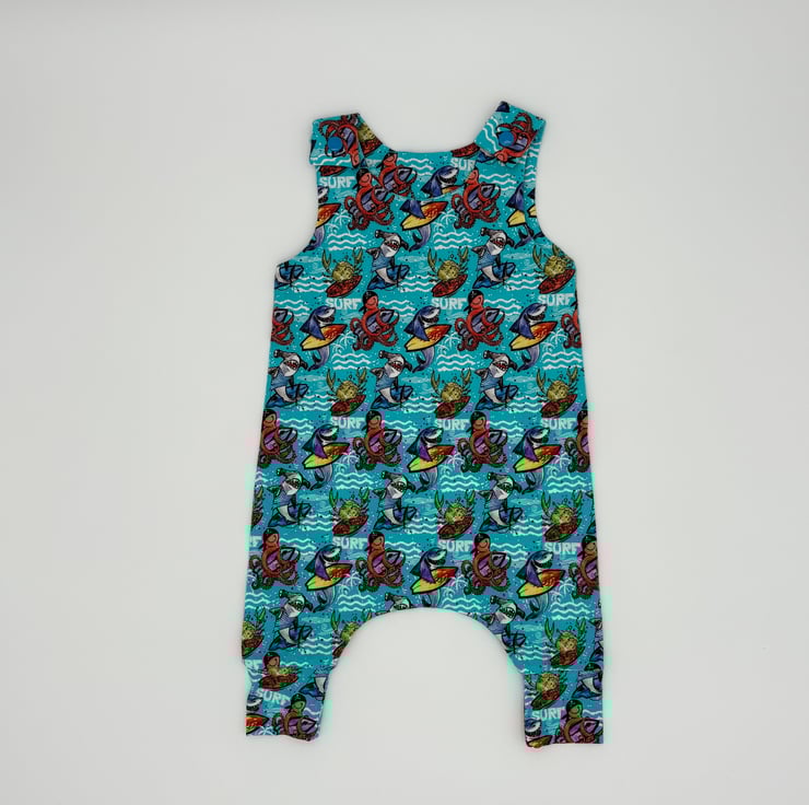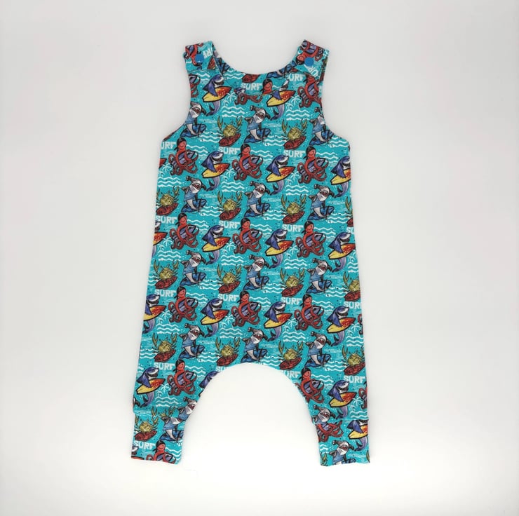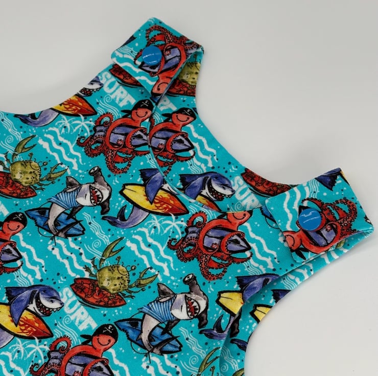 Handmade dungarees in cotton jersey fabric featuring sealife including sharks, crabs and octopus on surfboards. A colourful summer outfit that can be worn with a top underneath or with a jumper for colder days.