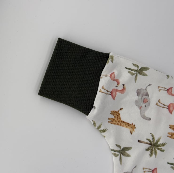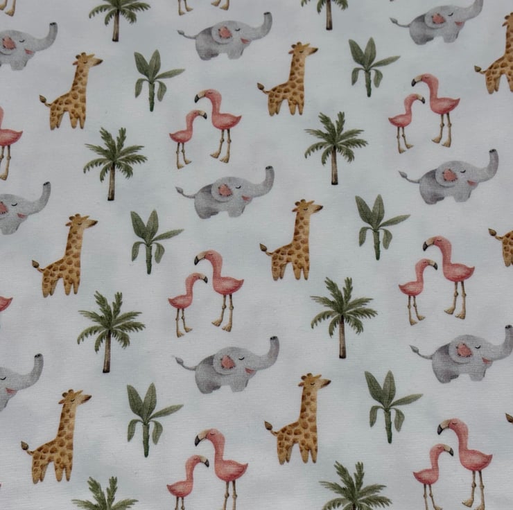 Handmade dungarees in a Giraffe Elephant Flamingo print.