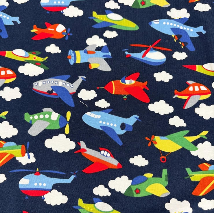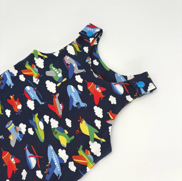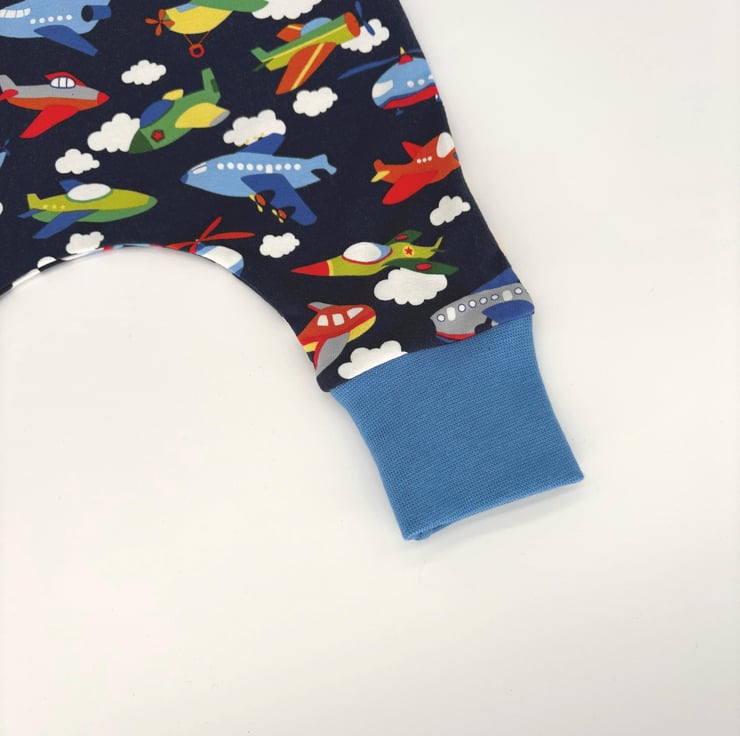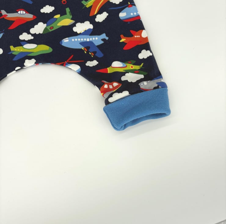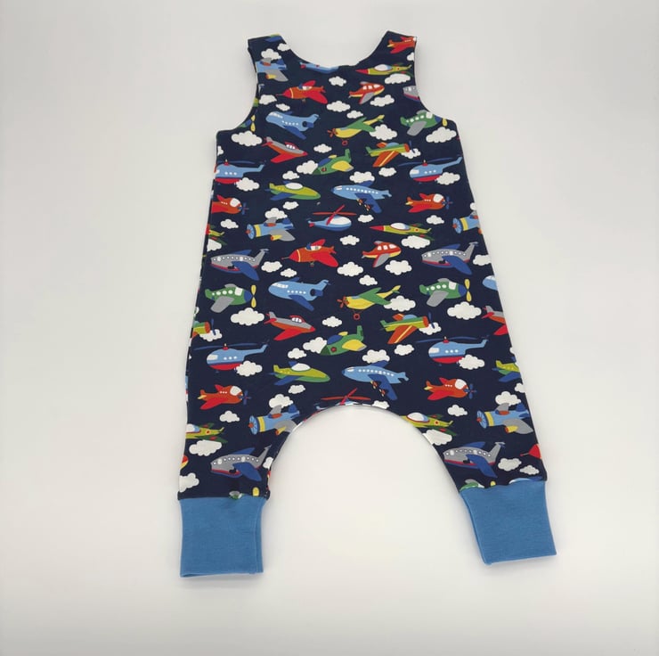 Handmade dungarees in a colourful planes and helicopters print on a blue background featuring clouds and with blue cuffs. Pre-made in various sizes.