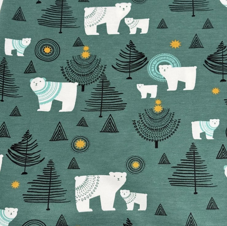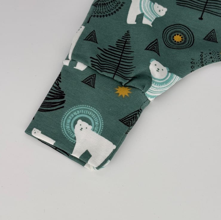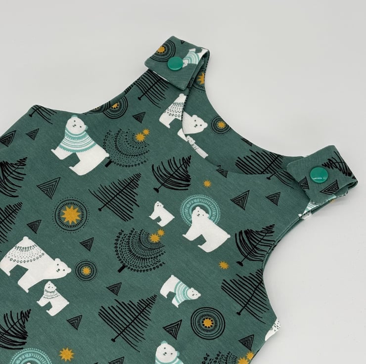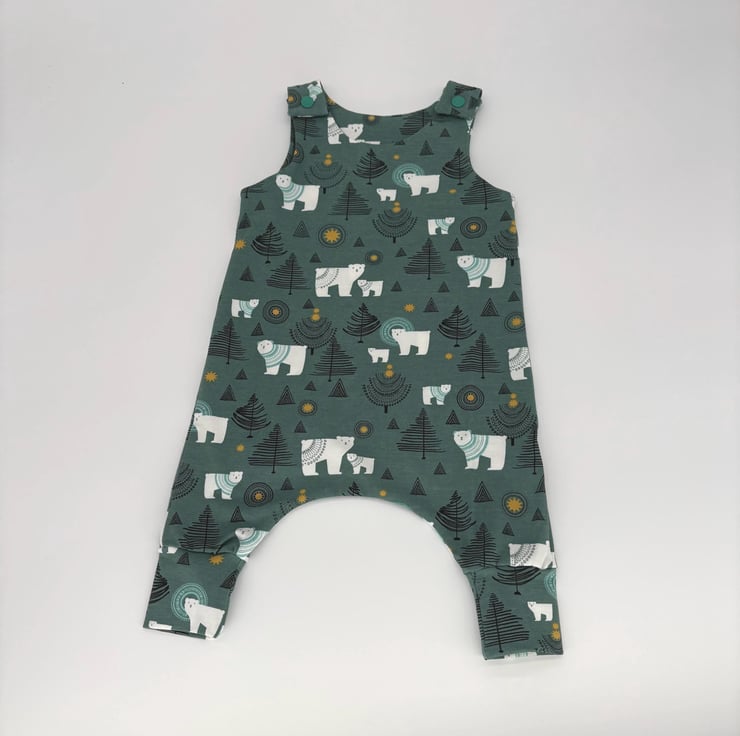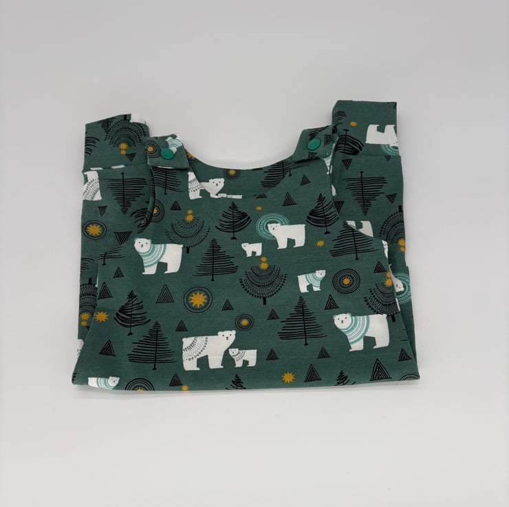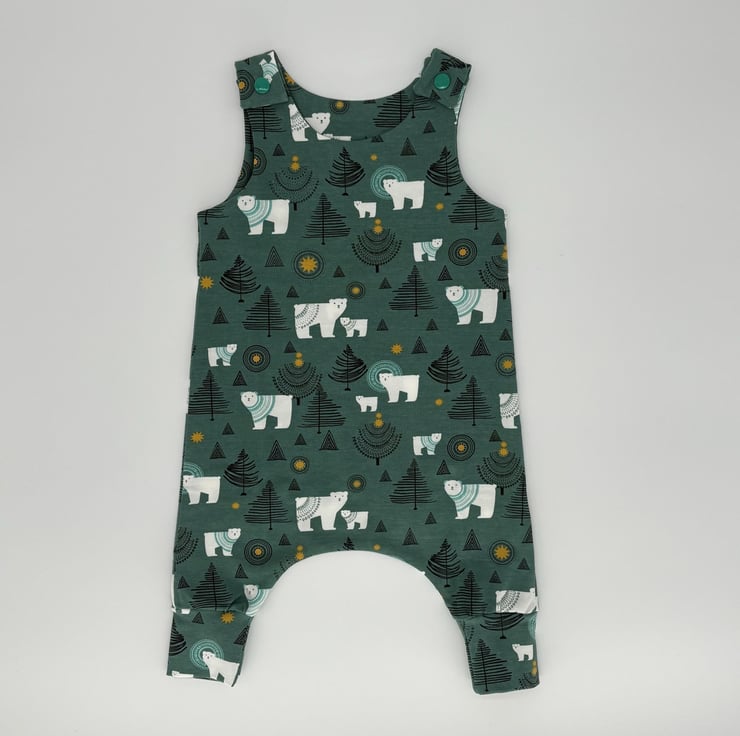 Handmade dungarees in a Polar bear Christmas fun festive print jersey fabric with matching cuffs and green plastic snaps. Age 0-3 or 3-6 months.