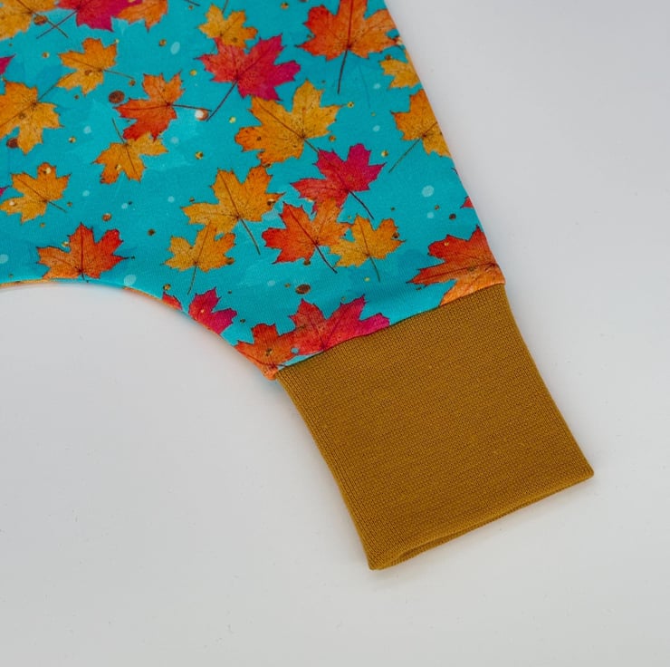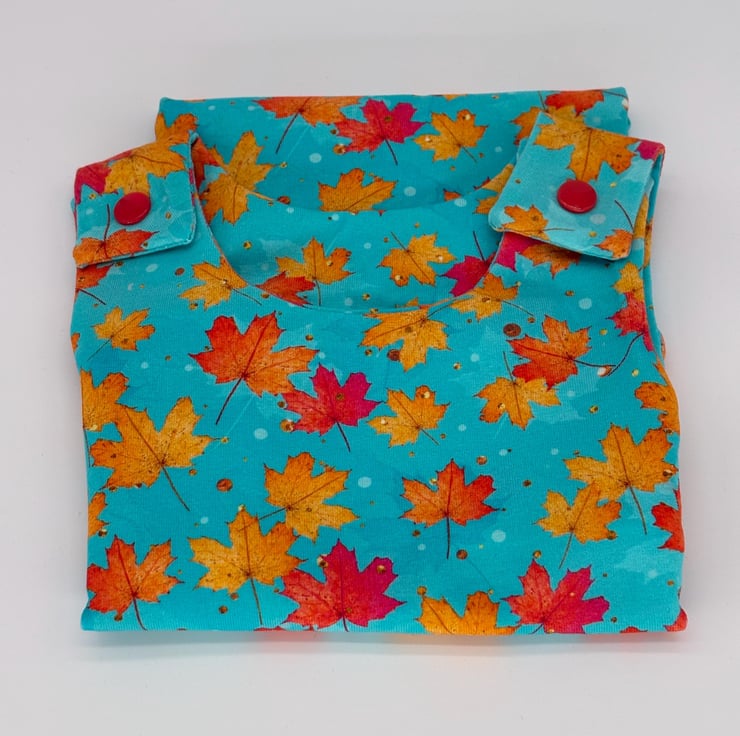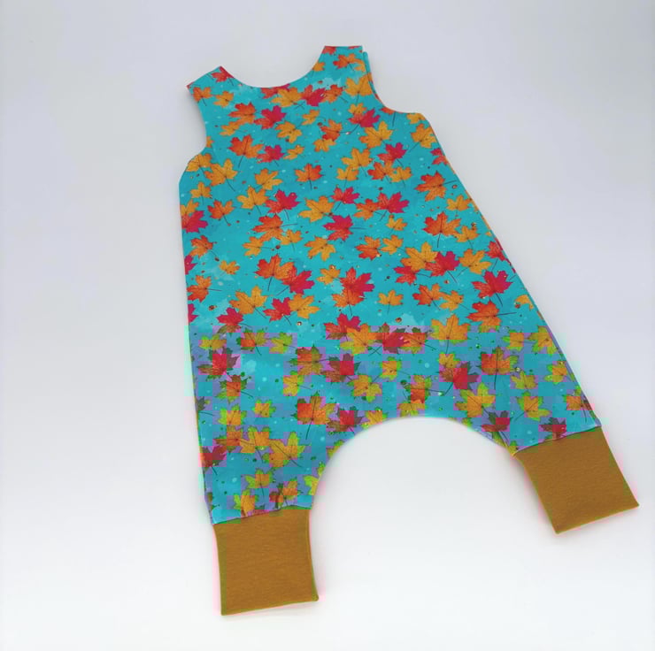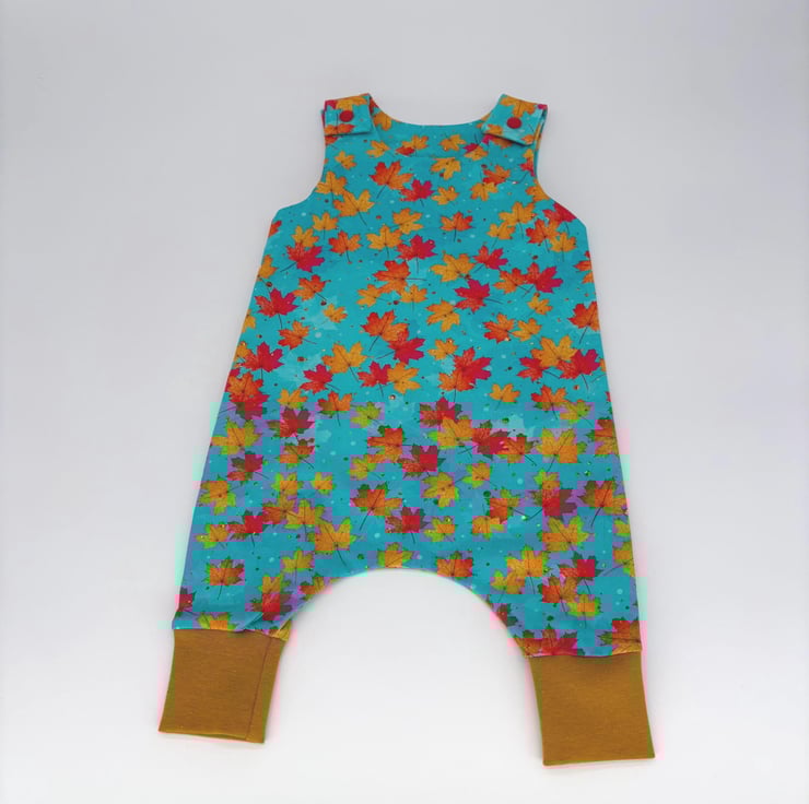 Handmade dungarees in an Autumn leaves print with red plastic snaps.