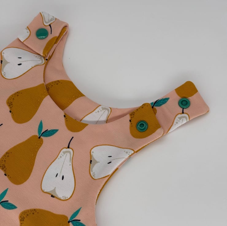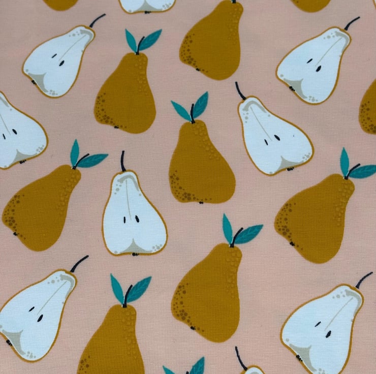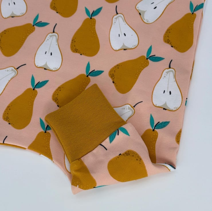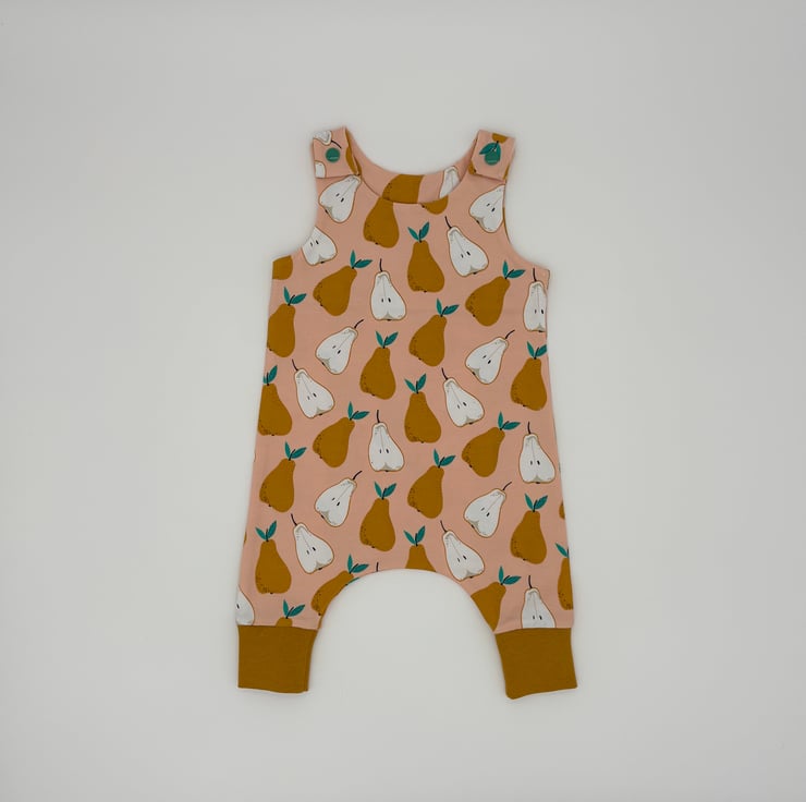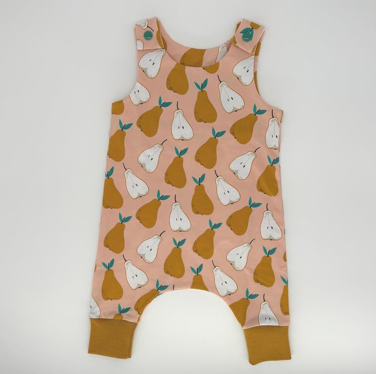 I love this giant pear print fabric. I originally saved it to make myself something and then decided to make dungarees for my friend's daughter. I used the same fabric to make a pair of dungarees to sell. This would make a great gift set.