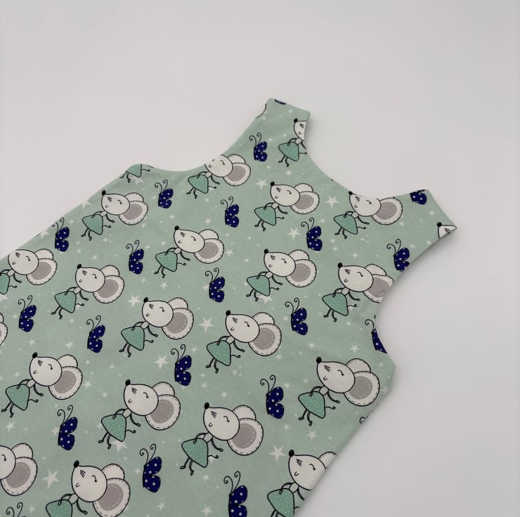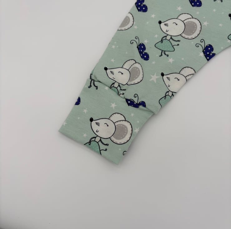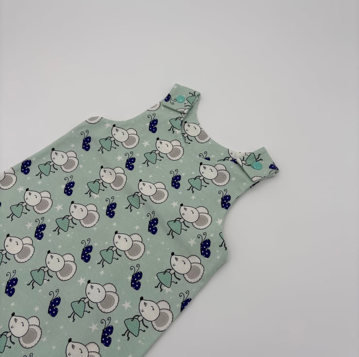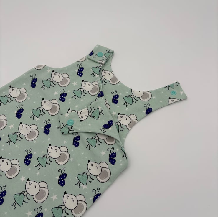 Mouse handmade dungarees, (9-12 or 12-18 months), on a light green background