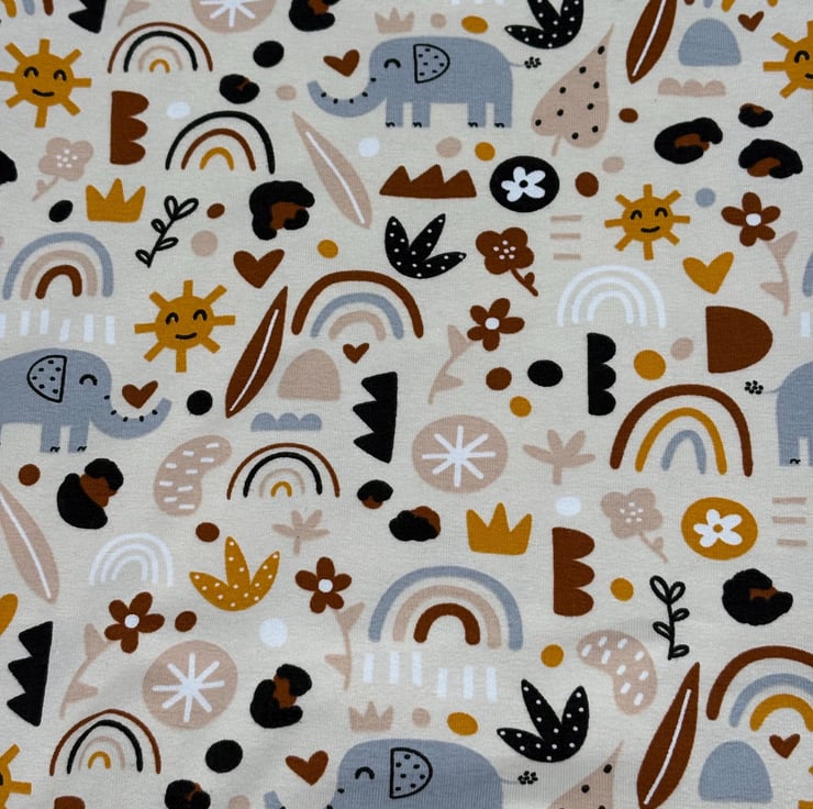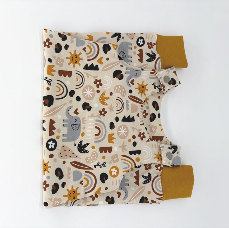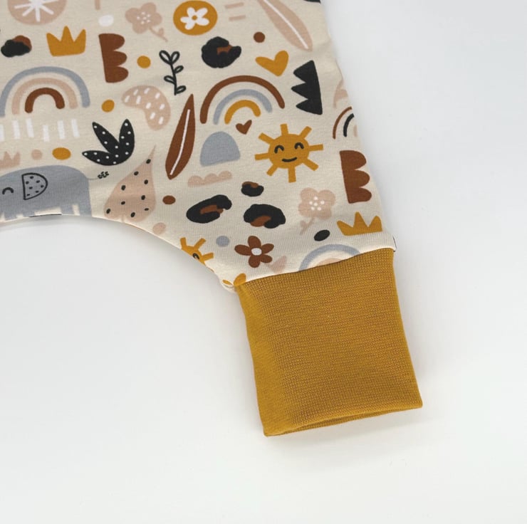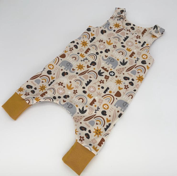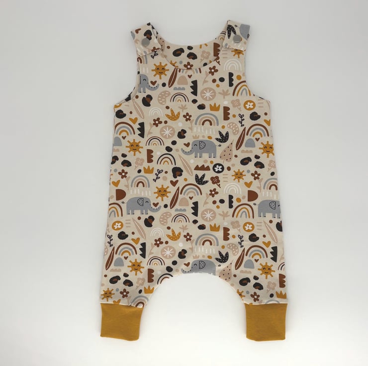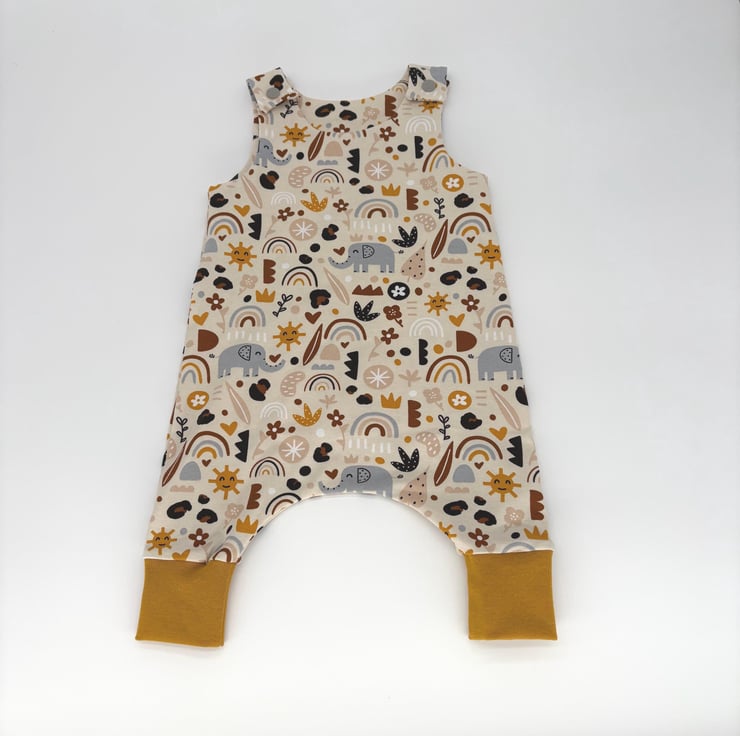 Handmade dungarees in an elephant sunshine print with ochre cuffs. In various sizes.