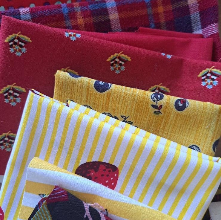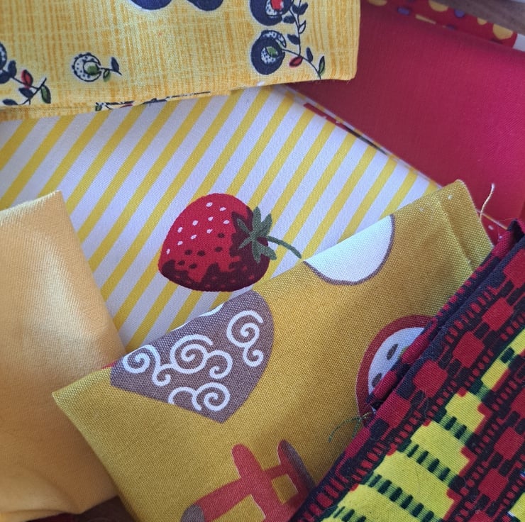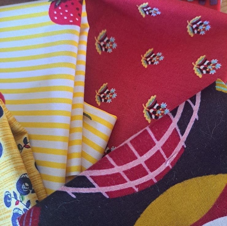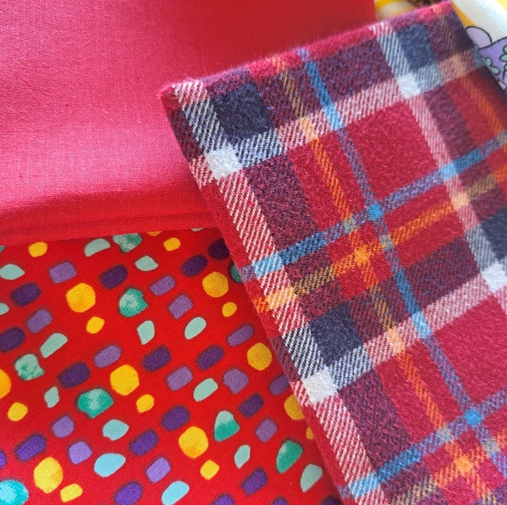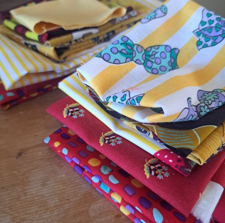 In your face - in a nice way - thanks to those bright reds and yellows. These bundles contain 8 assorted pieces of cotton fabric - some of it new, some of it repurposed - in bright and bold tones. The largest piece is approximately 58cm by 28cm.