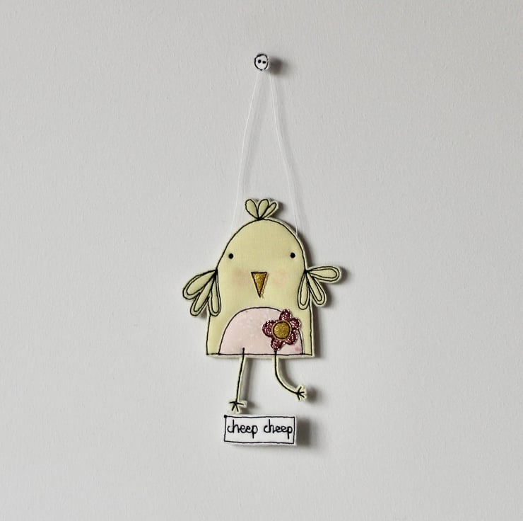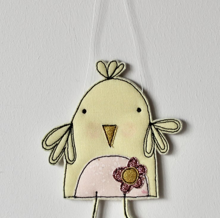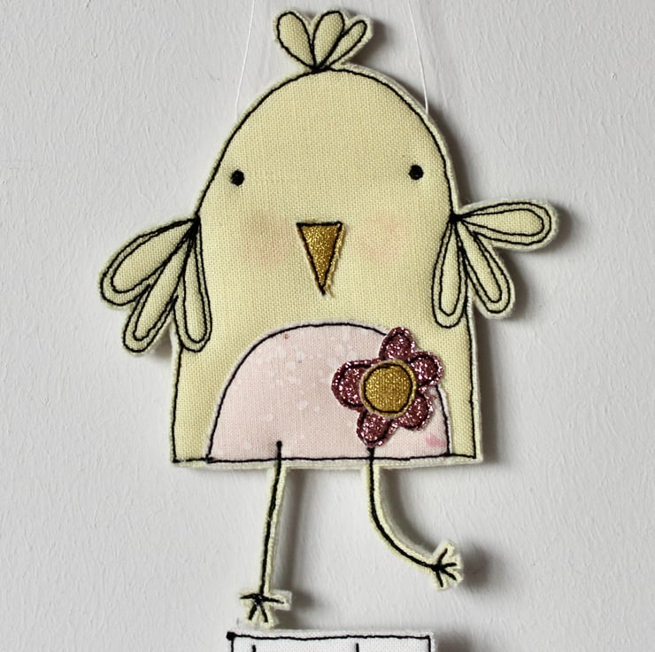 A delightful hanging decoration which is created using multiple layers of 100% wool felt, cotton cloth, glitter fabric and free hand machine embroidery. Chicks are cut out by hand using a very sharp pair of scissors.
