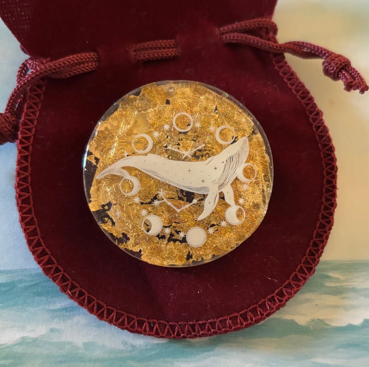 There is something special about whales. This brooch draws in on the whale and the moon phases