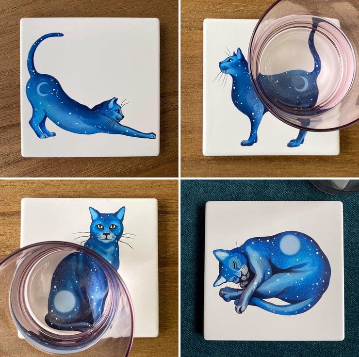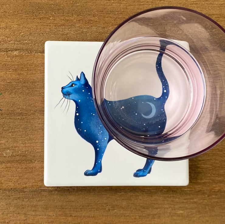 This unique ceramic coaster has a lovely, smooth sandstone finish, with a cork back. It shows off my drawing - Lunar Cat Standing.