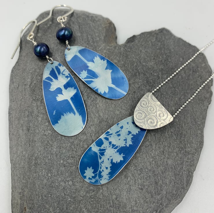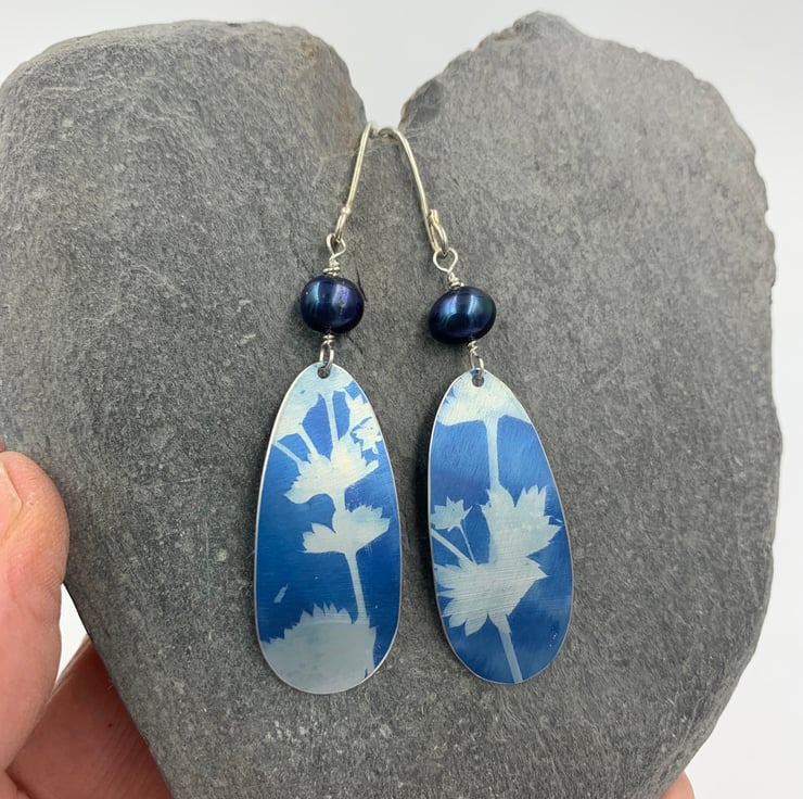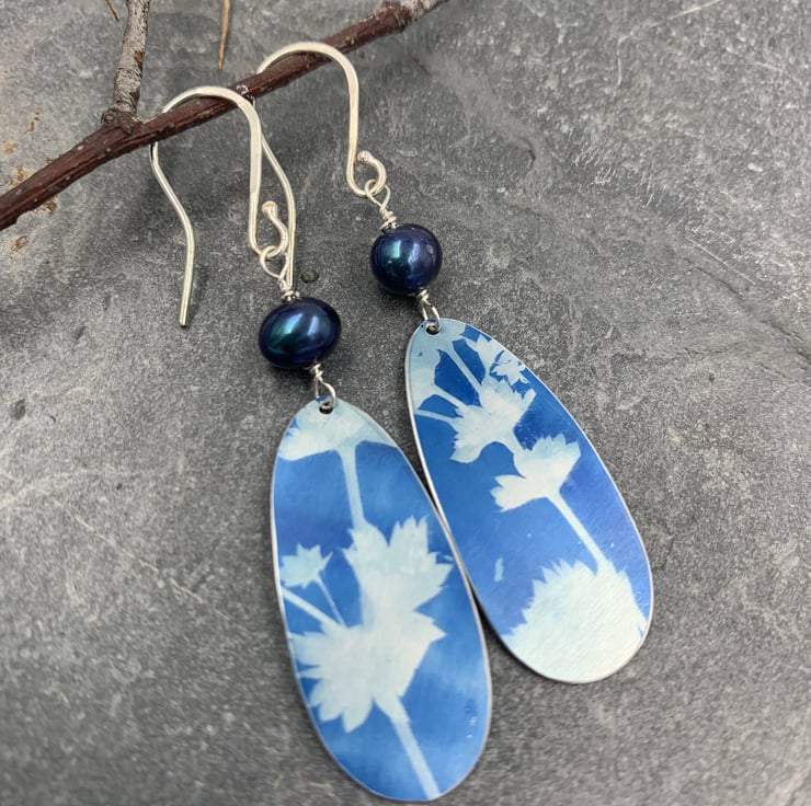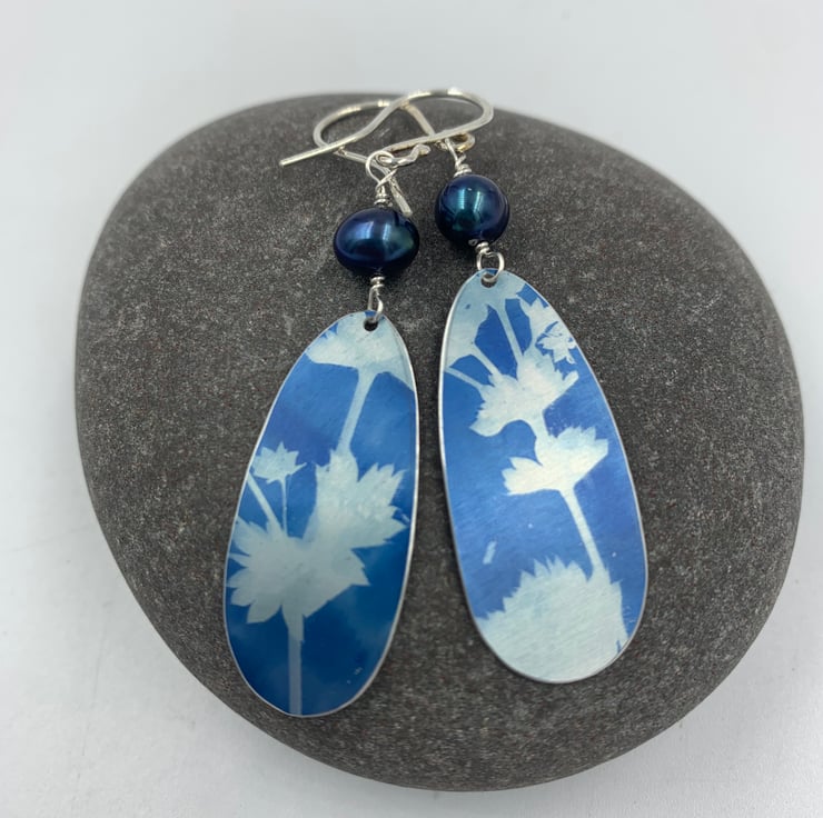 One of a kind cyanotype aluminium flower earrings! I carried out the cyanotype process on anodised aluminium using a Ladies Mantel flower. The beautiful delicate details of the flower stand out against the vibrant blue background. The organic curved shape of the earrings are complimented by blue freshwater pearls.