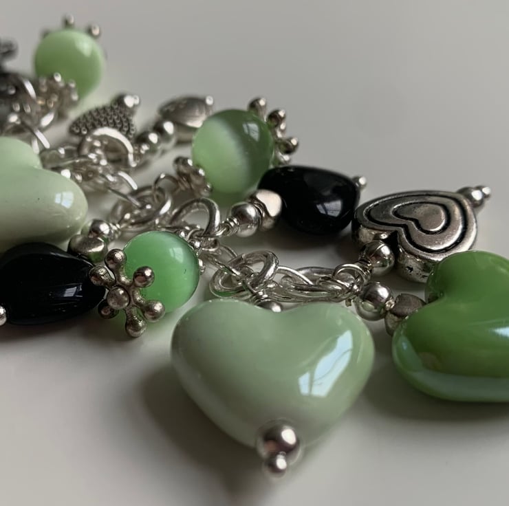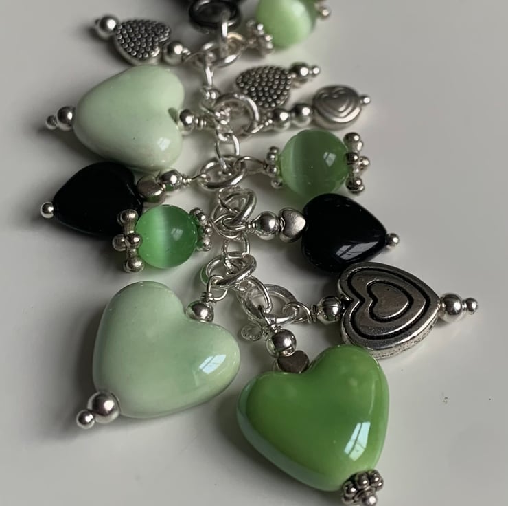 A loved up bag/anywhere charm made with ceramic, onyx agate and metal hearts. A unique piece attachable by a lobster claw heart ready for you attach and personalise your look. Measures approx 9cm in length