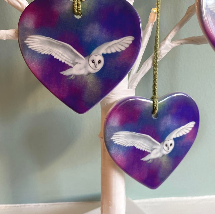 This heart shaped ceramic owl ornament shows off my flying owl illustration beautifully! I created the original illustration using a combination of chalk pastel, pencil and coloured pencil.
