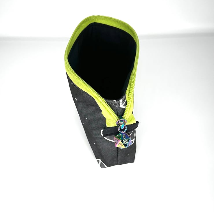 This make up bag is perfect for a RPG player or anyone interested in dice games. It has a lime green zipper with a D20 Dice zipper pull. It is lined with black cotton fabric.