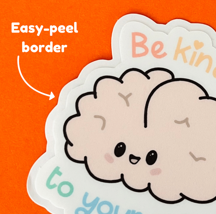 Just in case you need a reminder, this “be kind to your mind” sticker features a brain, digitally drawn by me, with a happy face.