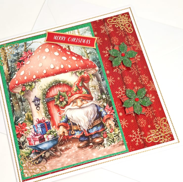 This luxury cute card is handmade by me, an Elf with a mushroom house Christmas card with 3D elements.