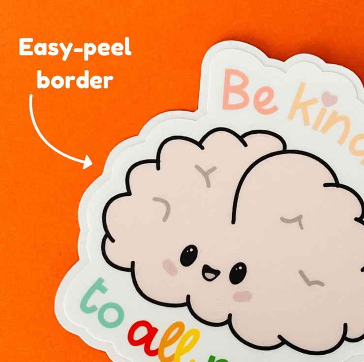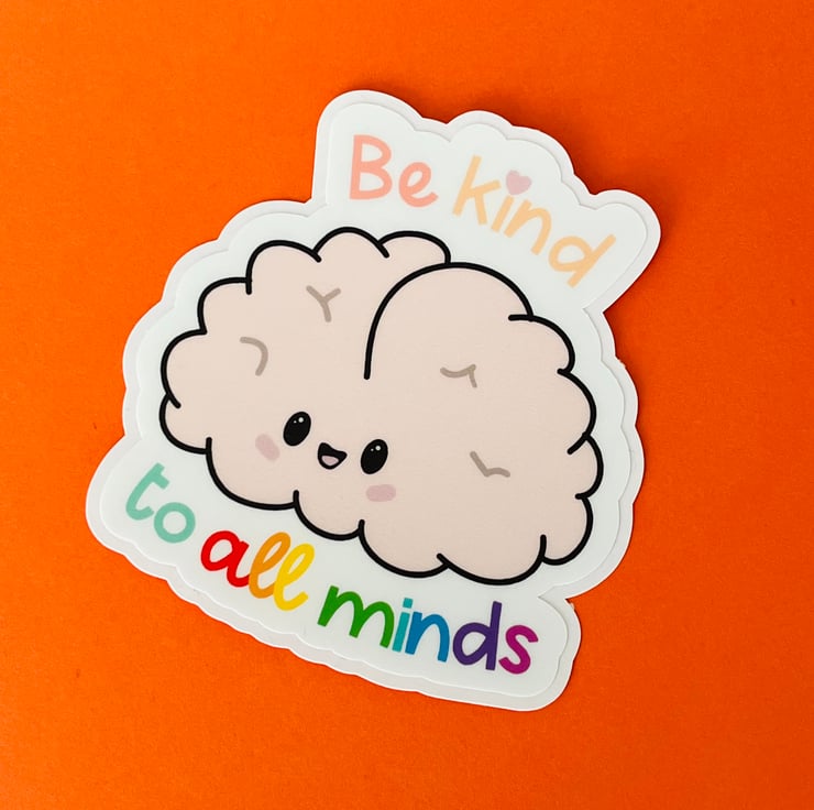Just in case you need a reminder, this “be kind to all minds” sticker features a brain, digitally drawn by me, with a happy face, as a reminder to be kind to all different types of minds, whether they are neurodivergent (represented by the rainbow colours) or not.