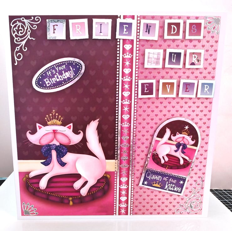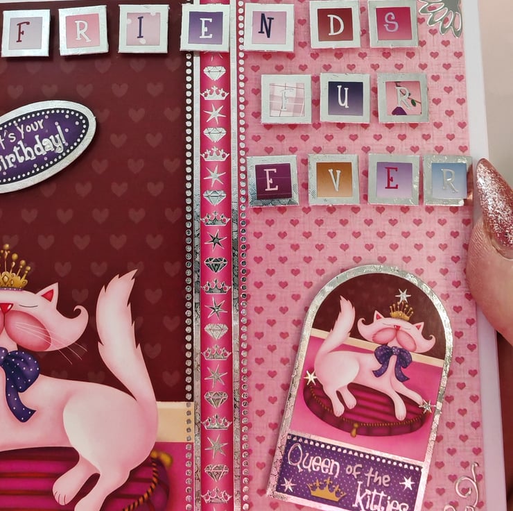 This luxury Best Friends card is handmade by me and features a lovely pink cat wearing a queen of the kitties crown.