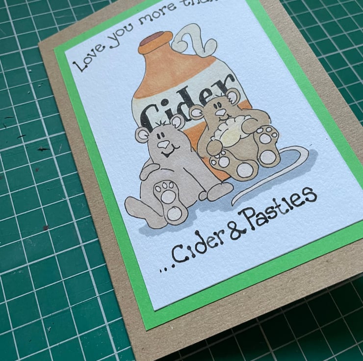 This fun card is created using an original mouse illustration. I have mounted this onto green card and then attached to a natural coloured recycled card blank. The words “Love you more than cider and pasties” are handwritten in black ink.