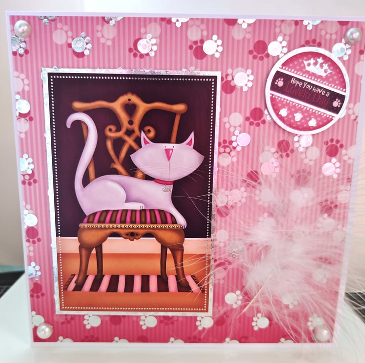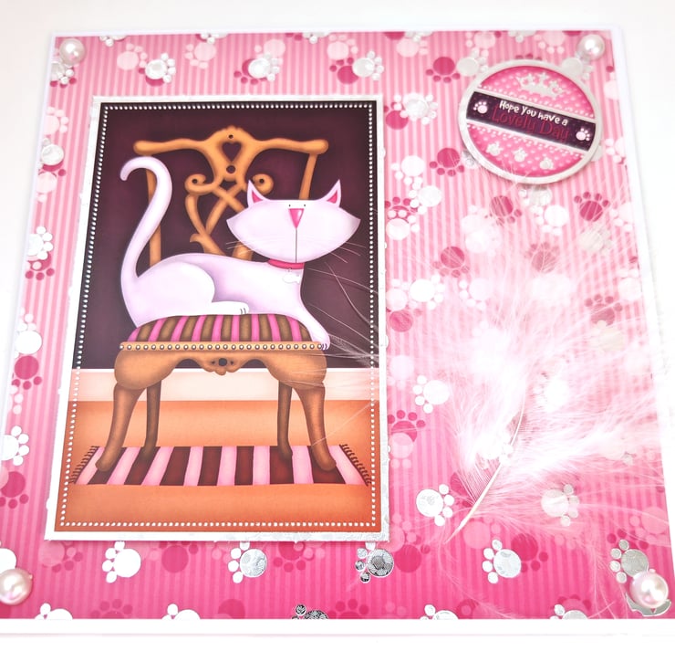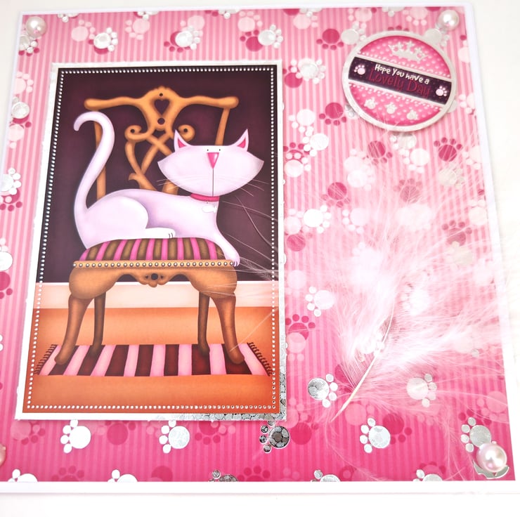 This luxury Birthday card is handmade by me and features a lovely pink cat on a pink paw background, lounging on a chair with a large white feather embellishment.